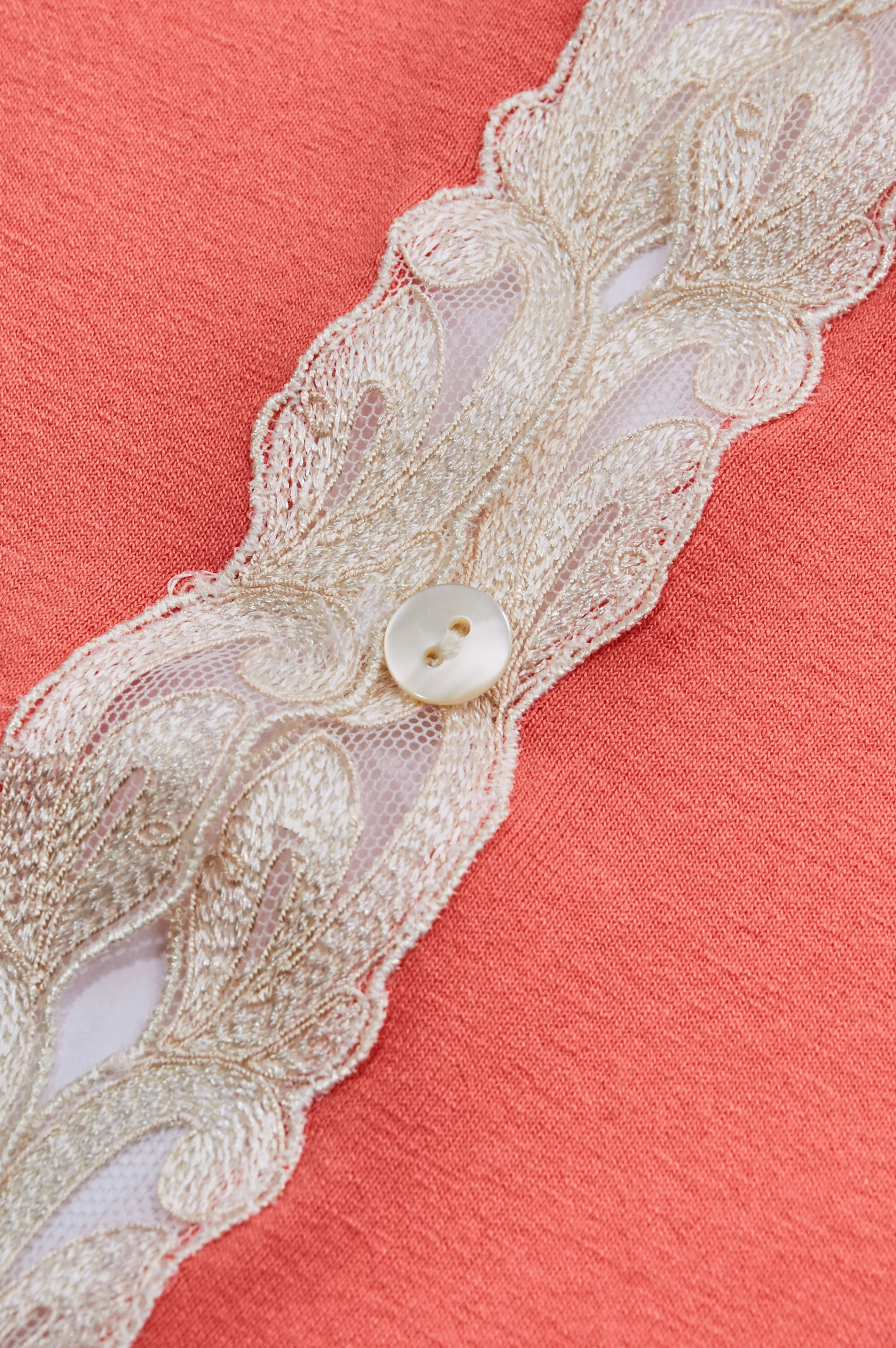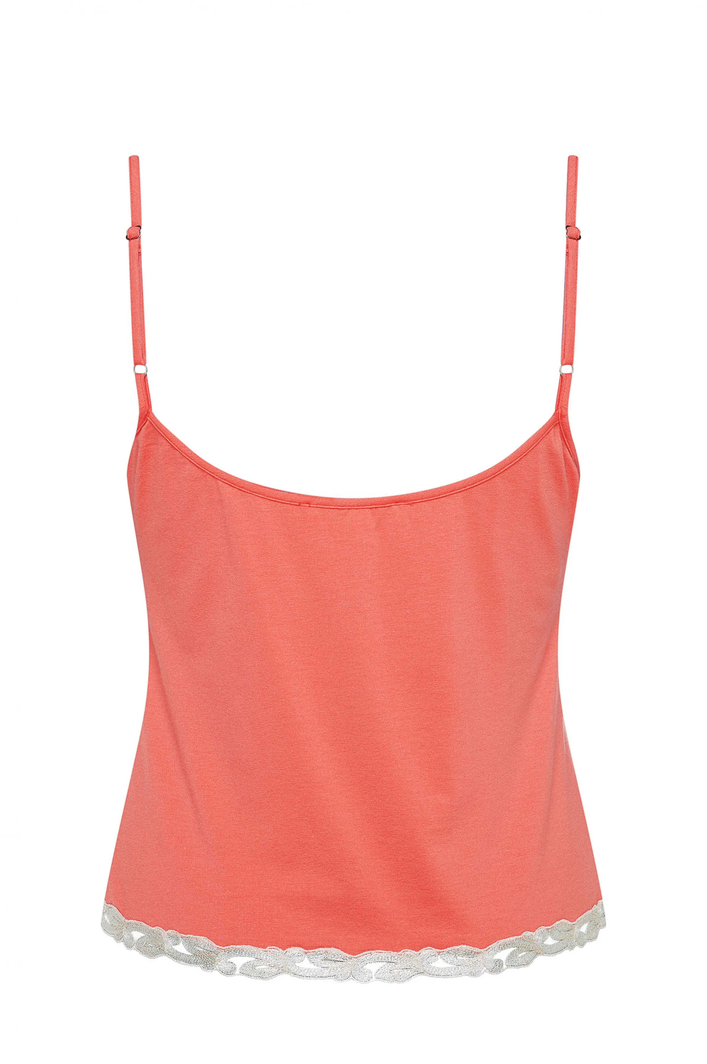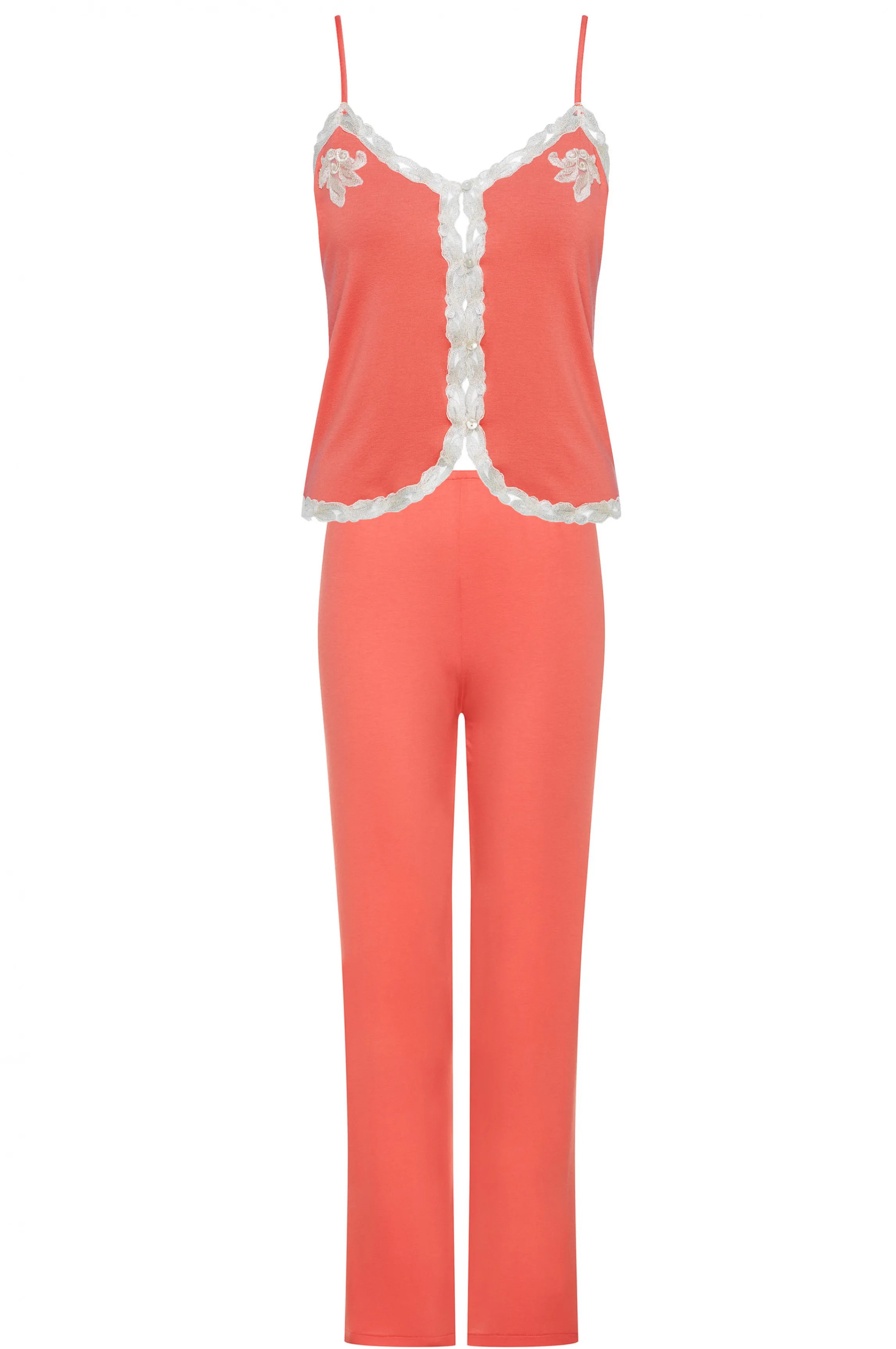 Modal pyjamas in pink coral color. thin straps top with white lace trmming and long pants