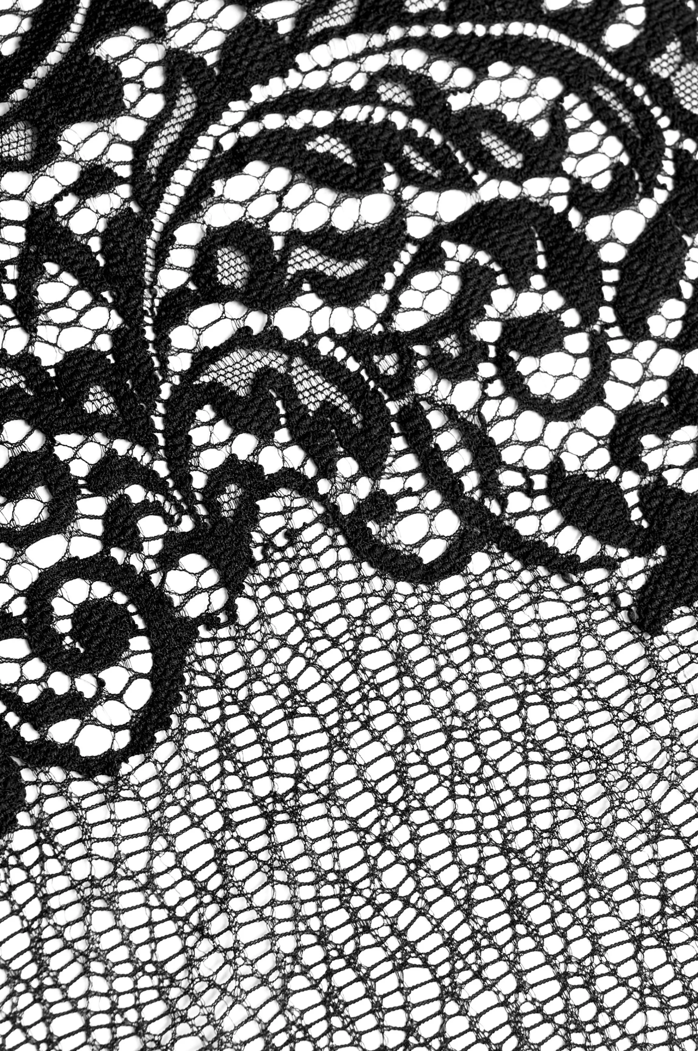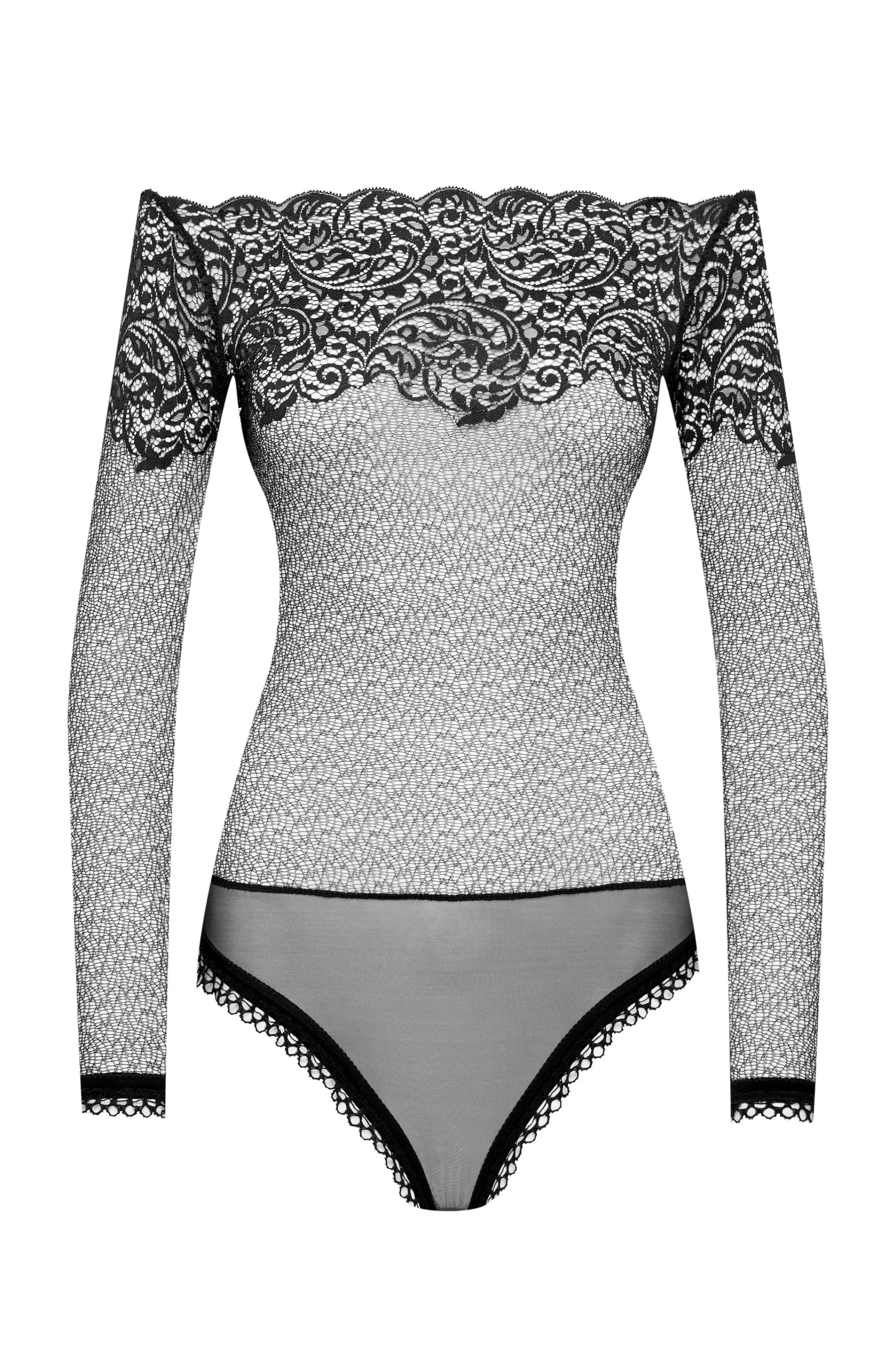 Sheer black lace bodysuit with naked shoulder cut. Lacy details on the wrists and legs.