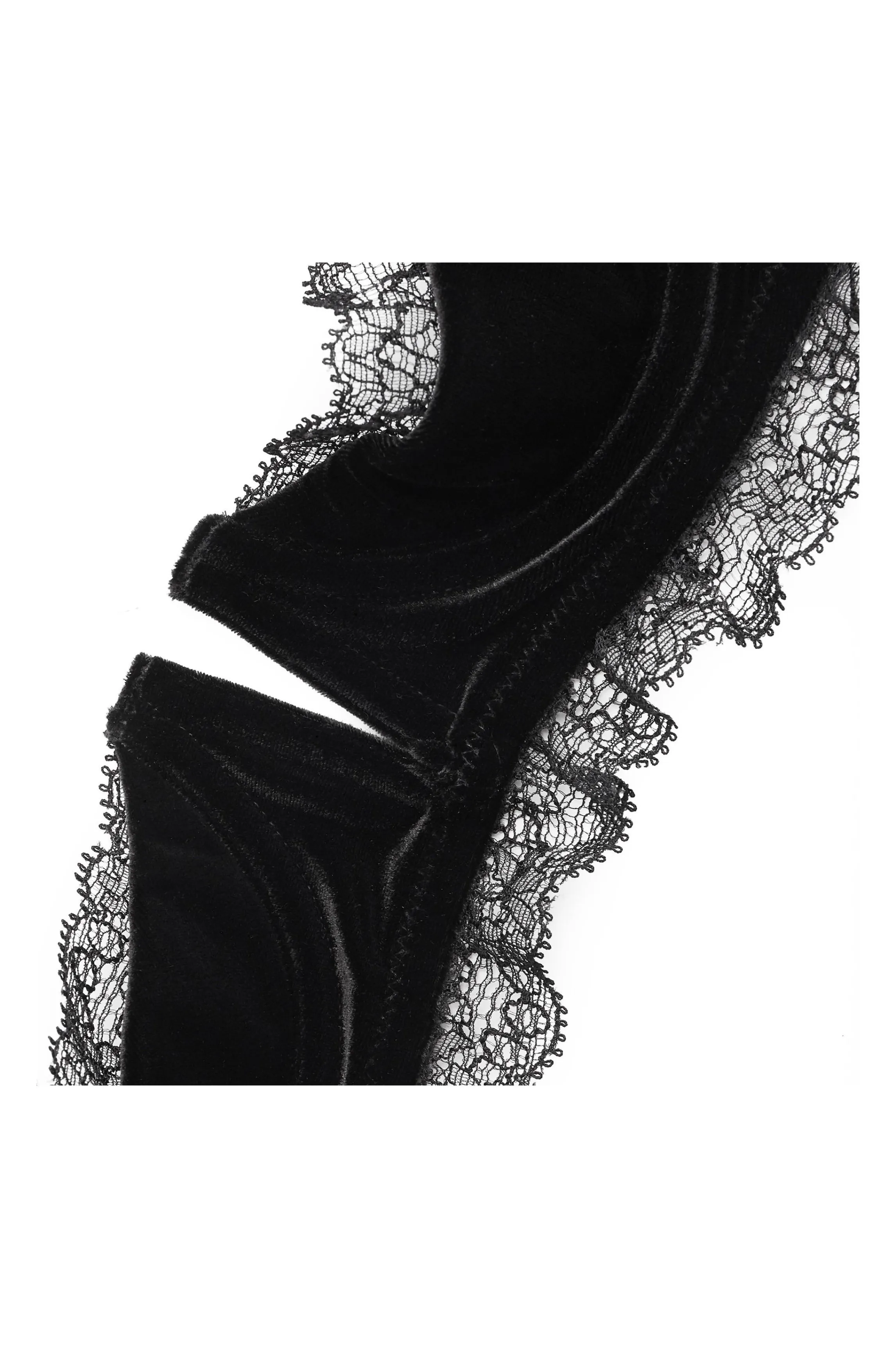 This bra is a shelf bra which perfectly embraces the roundness of the breast. Made of velvet, for this limited edition, the gold jewellery on the straps and refined lace trimming makes it precious, stunning and one of a kind. The epitome of sexiness and sensuality.