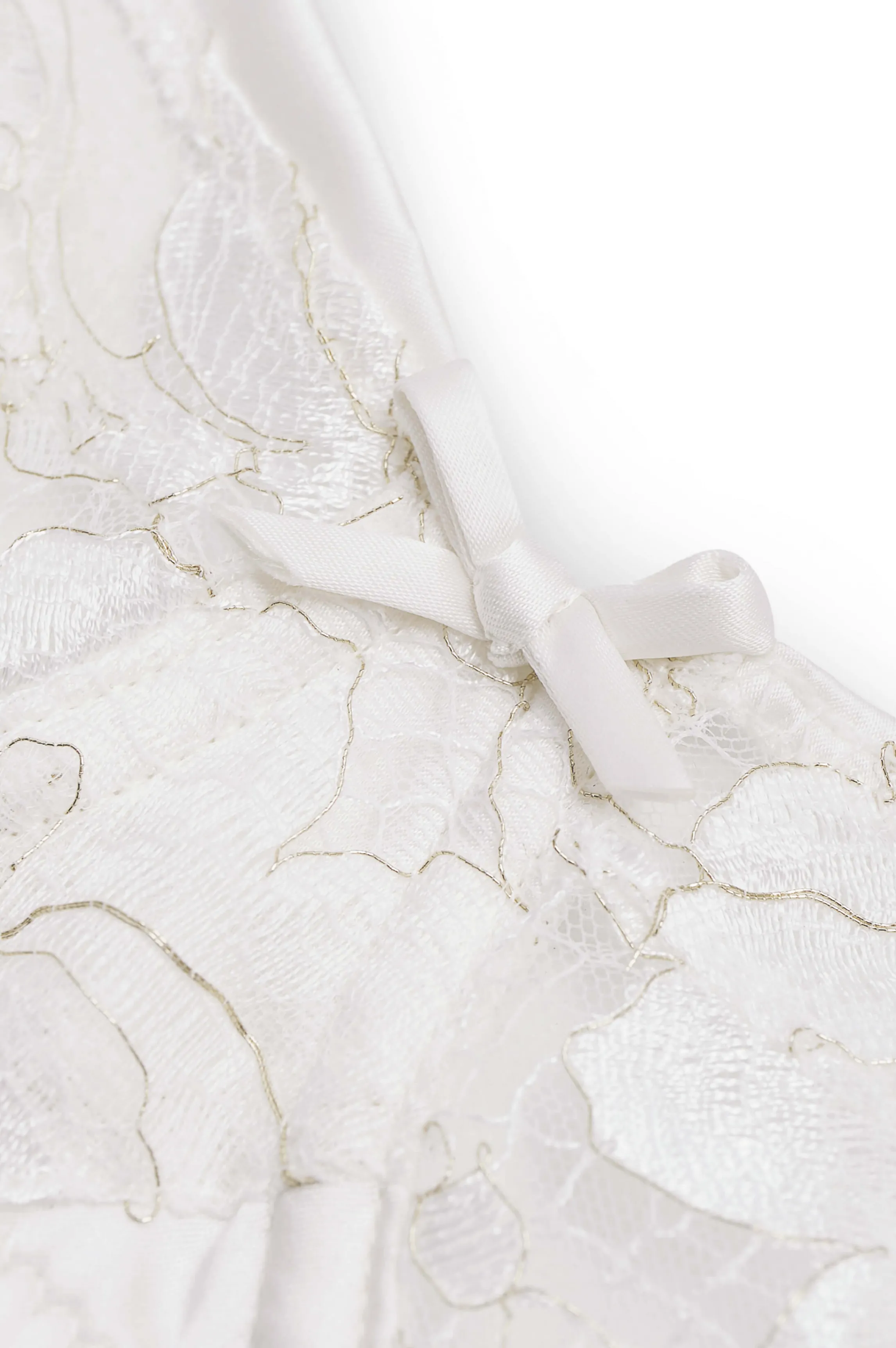 The 479 bra is one of Cadolle’s most iconic styles. The transparent tulle cups are covered with a fine ivory lace and a golden thread borders its floral patterns. This fatal cut gives a nice shape to the breasts and enhances them for a breathtaking cleavage. With the Mimi ivory Pivoine lace panties, you will have the perfect set for your big day.