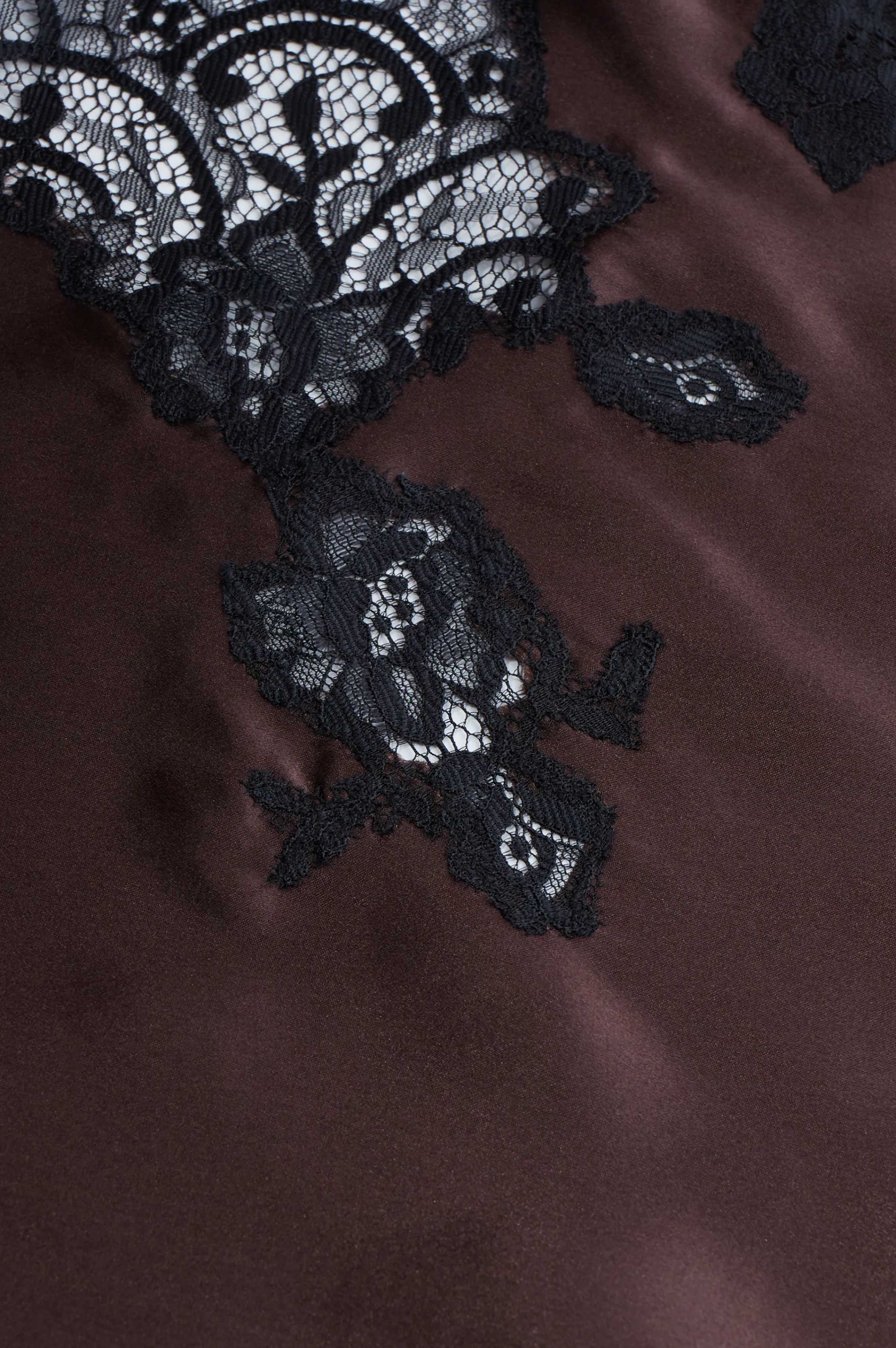 Brown silk nighty with black lace for an amazing look. The lace encrusted décolleté looks stunning when worn. A bold contrast of colors to express you sensuality.