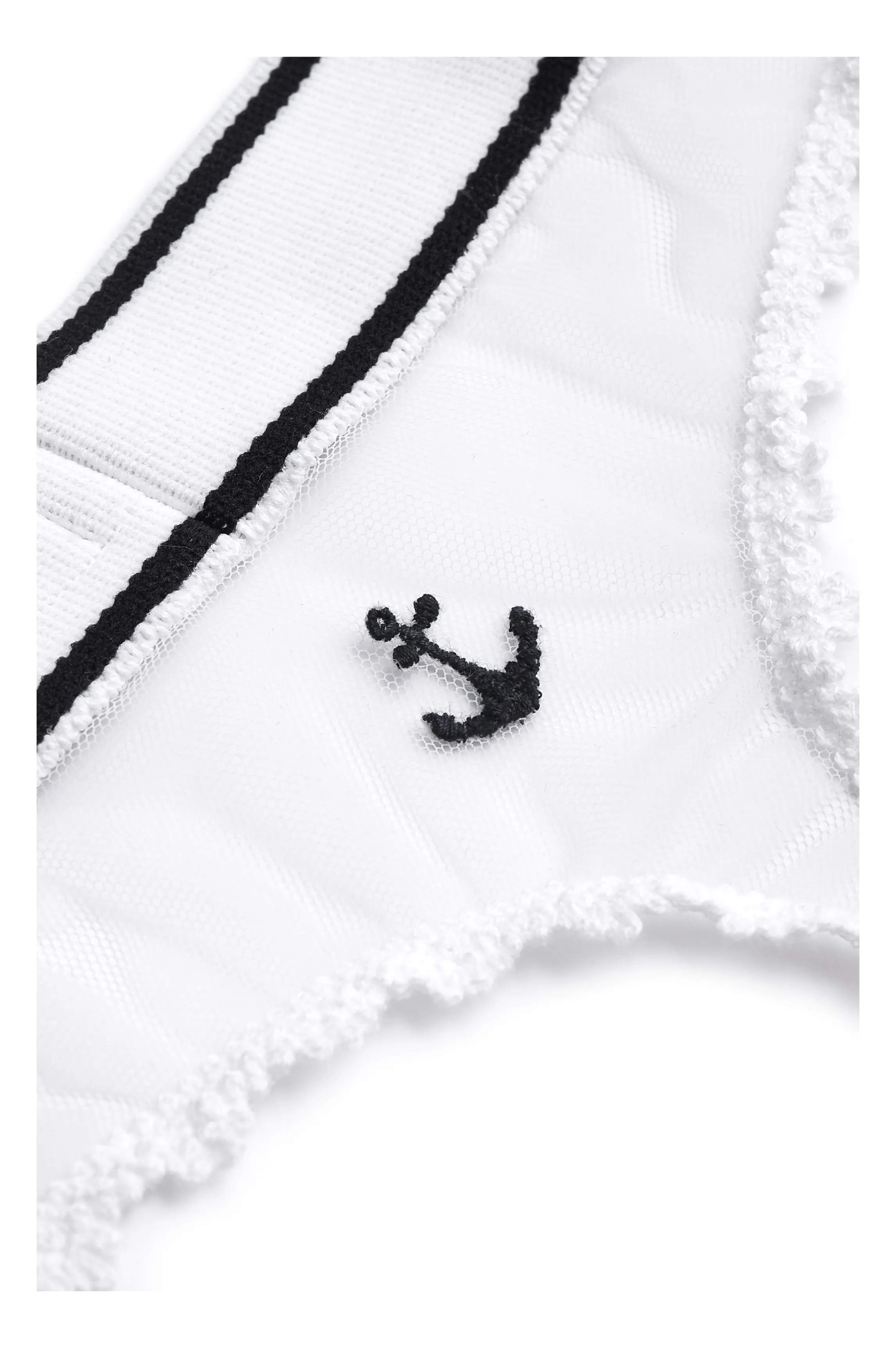 The classic Cathy thong made of white tulle, with a little sea anchor embroidered on the back. An elastic; striped band …