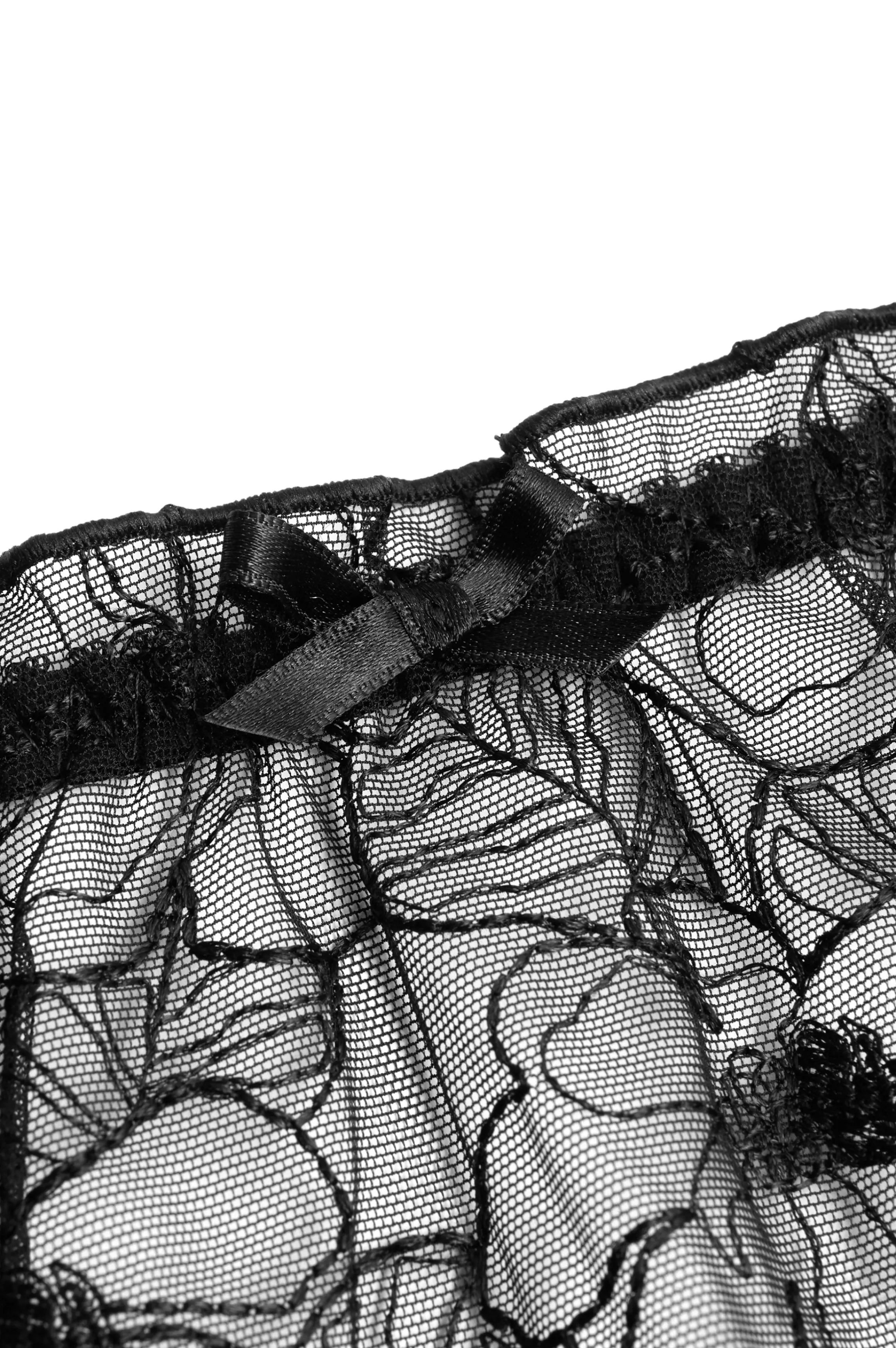 Black lace thong finely decorated with tiny ruffles .