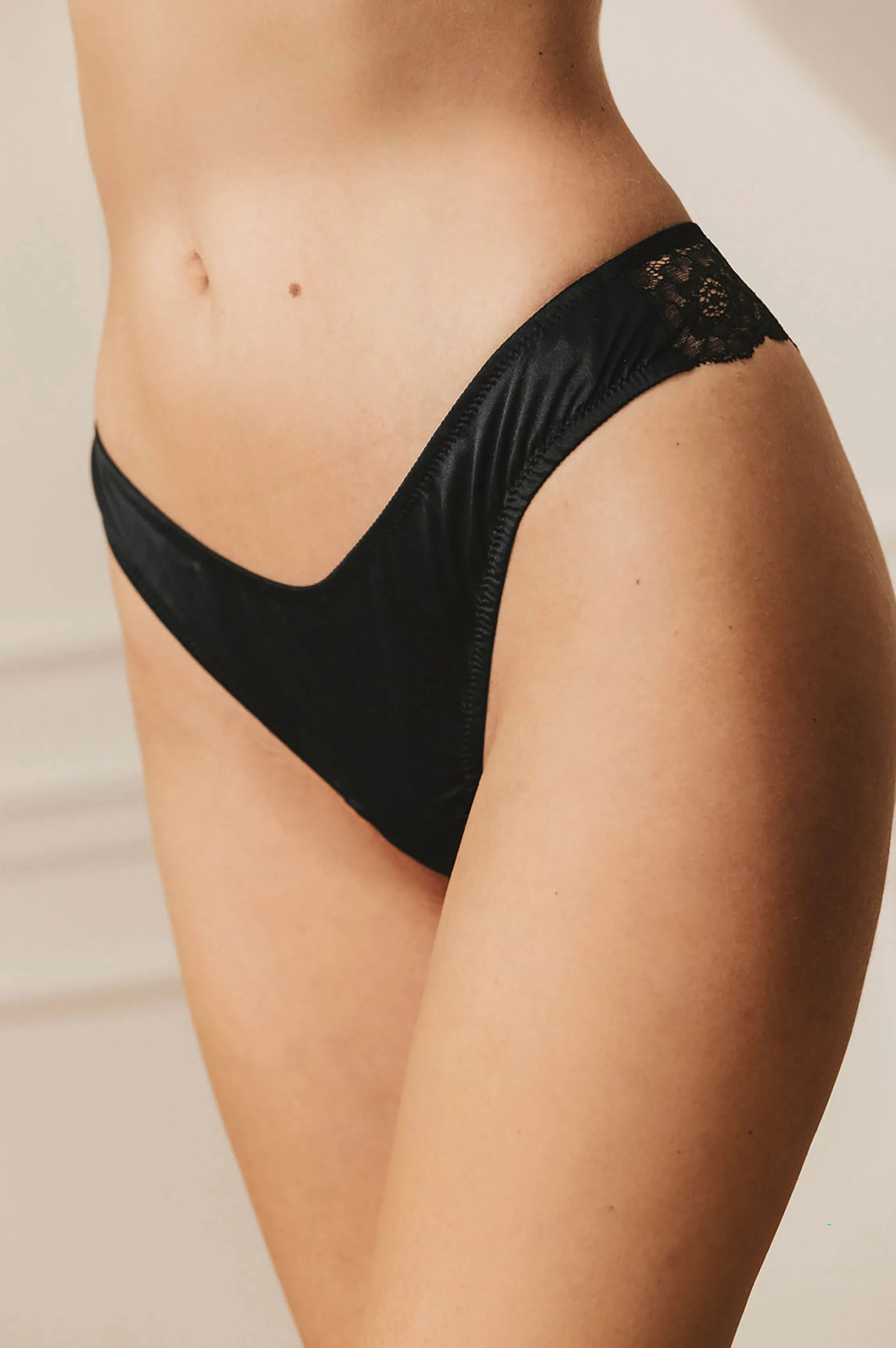 Black Tanga cut; satin front and lace back; amazing design of the lace on the skin.