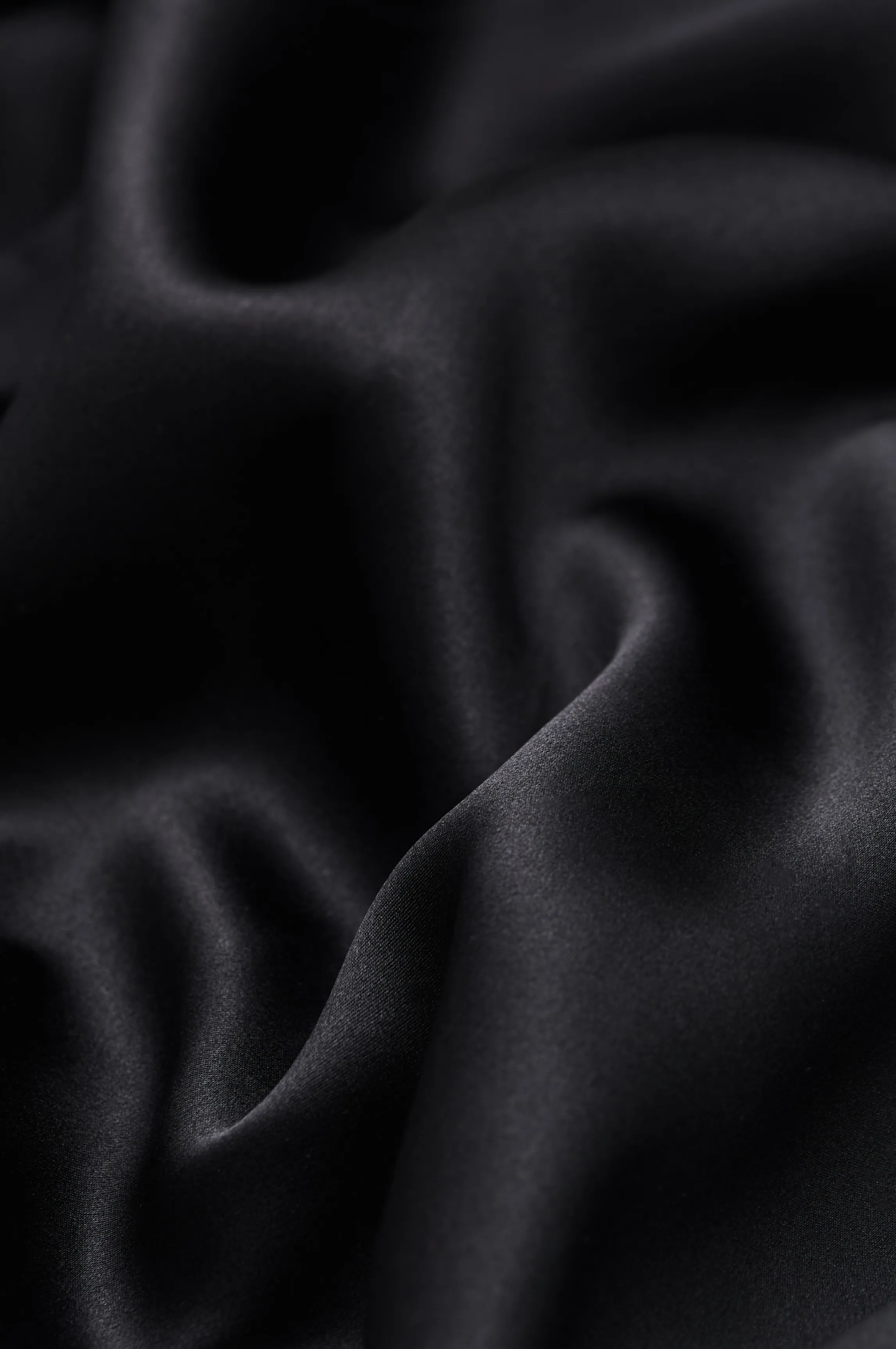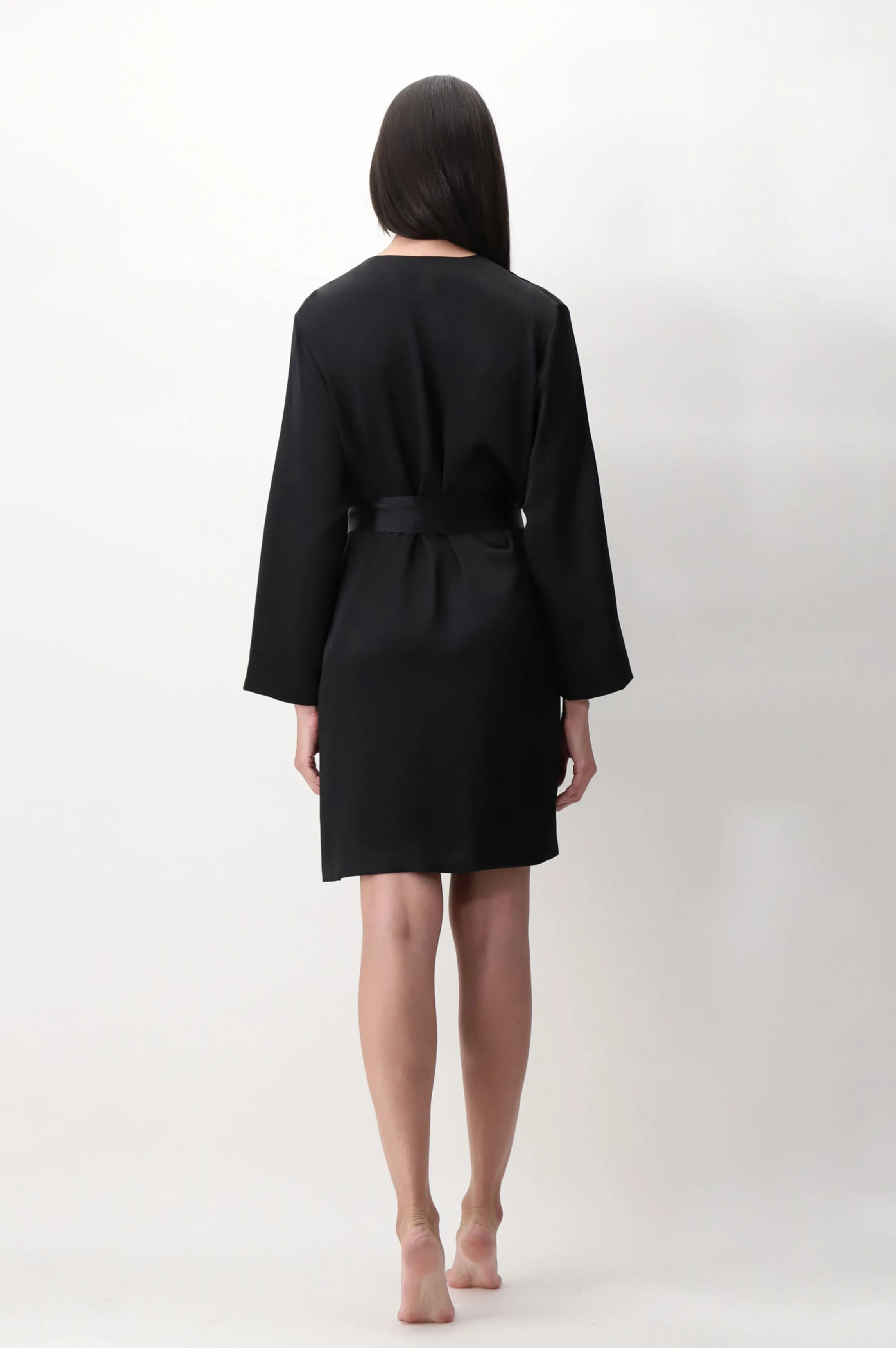 Black silk robe with two pockets, a silk belt and and an inside tie. Classic and elegant. Short cut