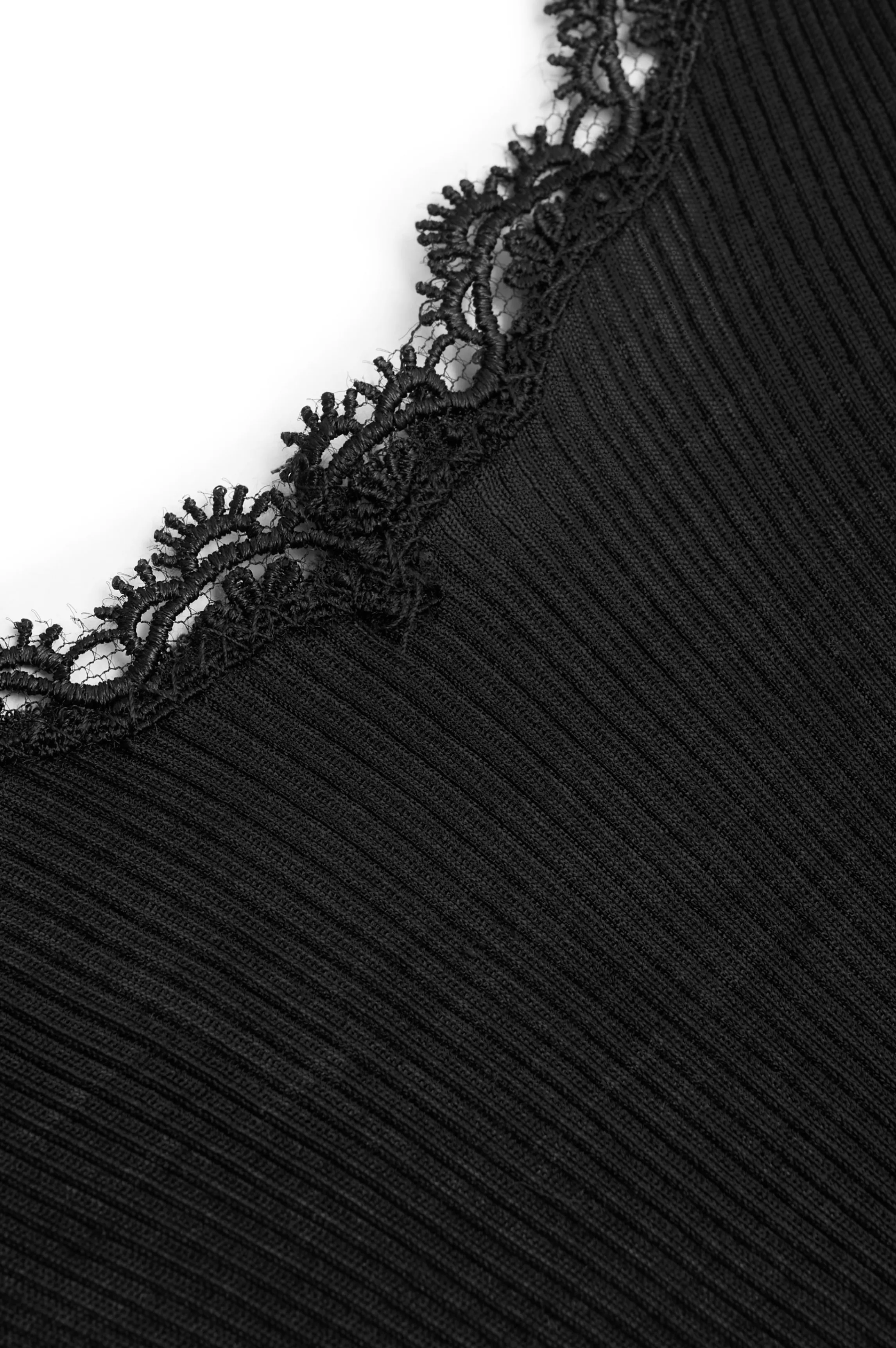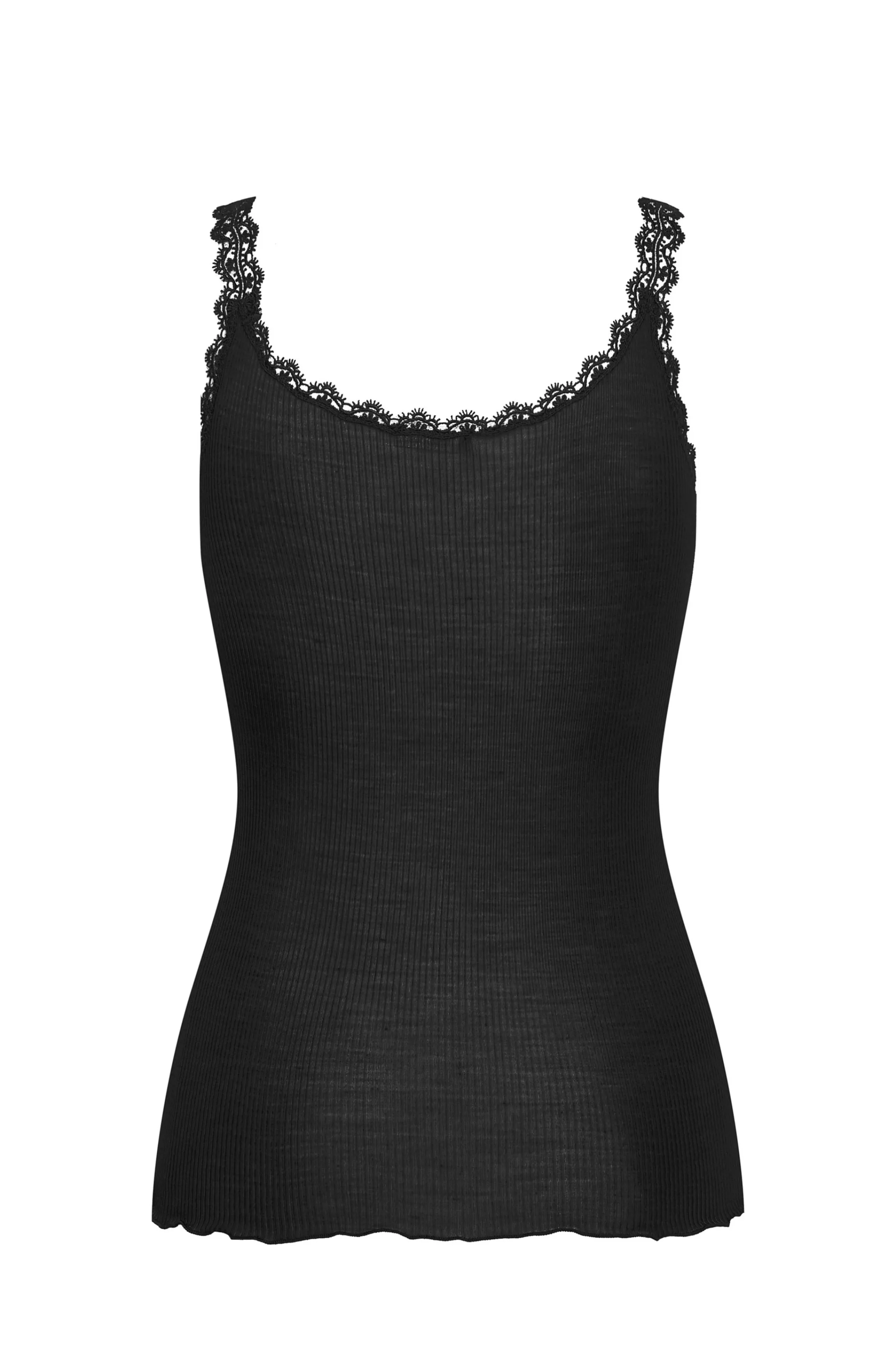 Black silk tank top. Fine pleated fabric. Lace-trimmed straps and neckline.