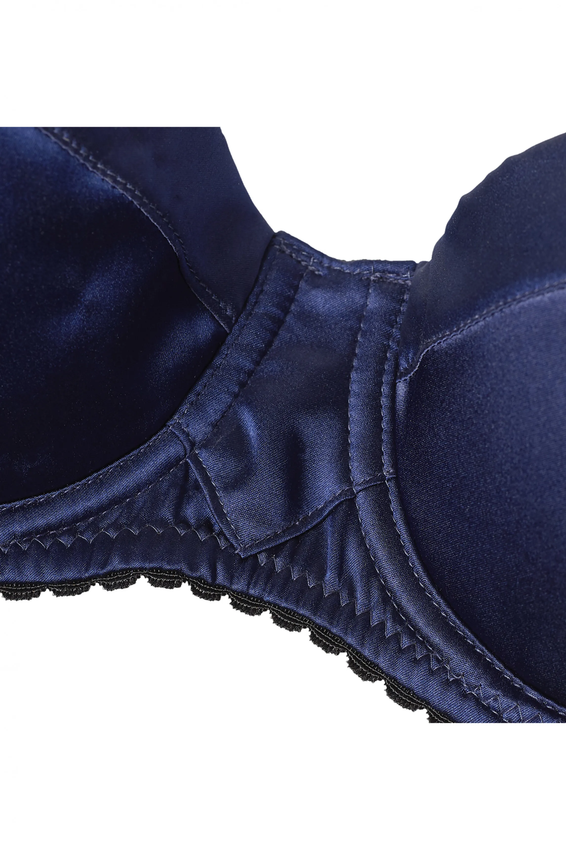 This bra is entirely made of satin. The semi-cups offer a plunging neckline as well as perfect support of your bust. The soft, wide straps lie comfortably on the shoulders. The timeless navy blue color is simple and elegant, perfect for any occasion.