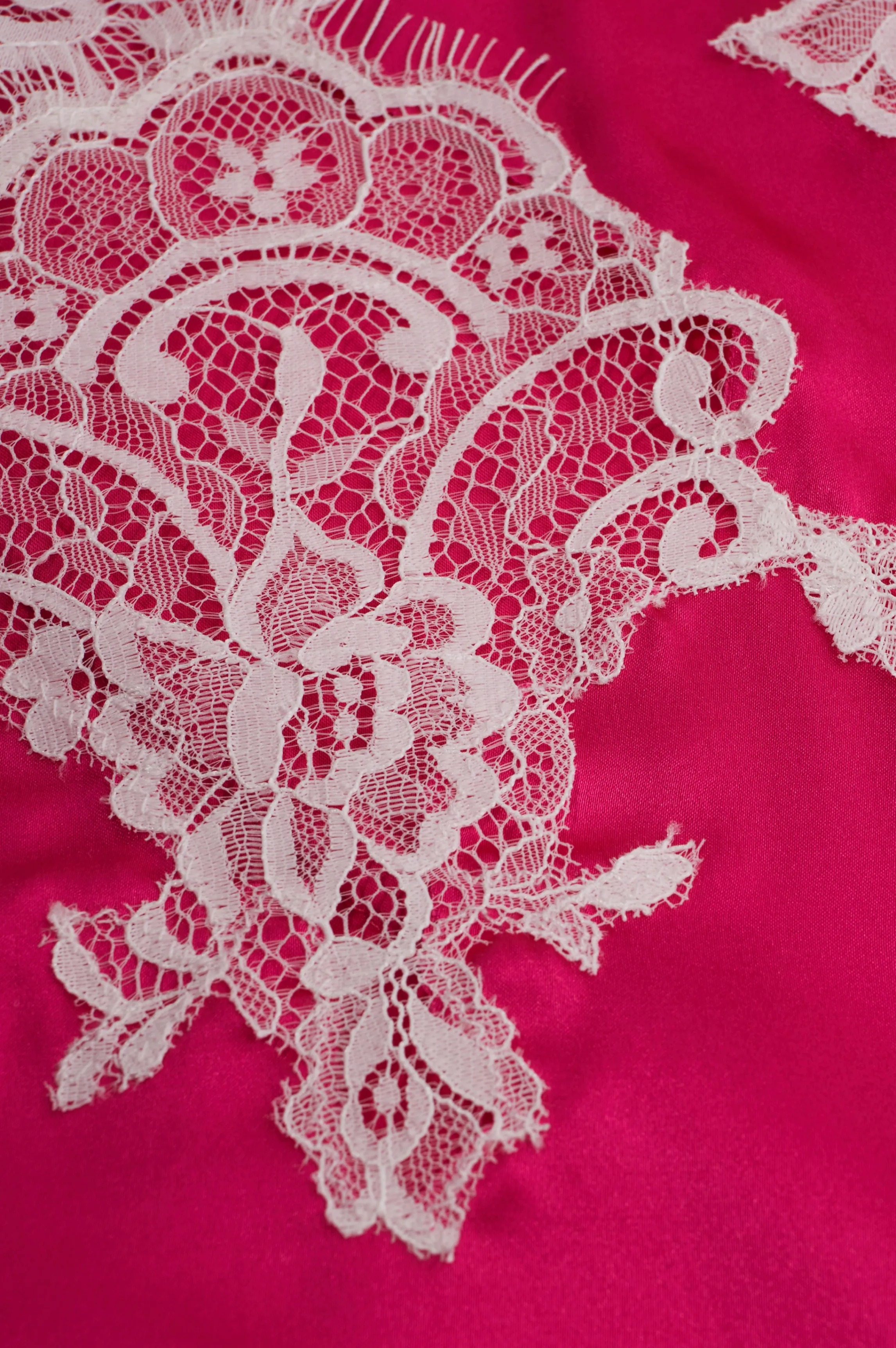 A shoking pink silk babydoll with exquisite white lace details. Adjustable thin straps.