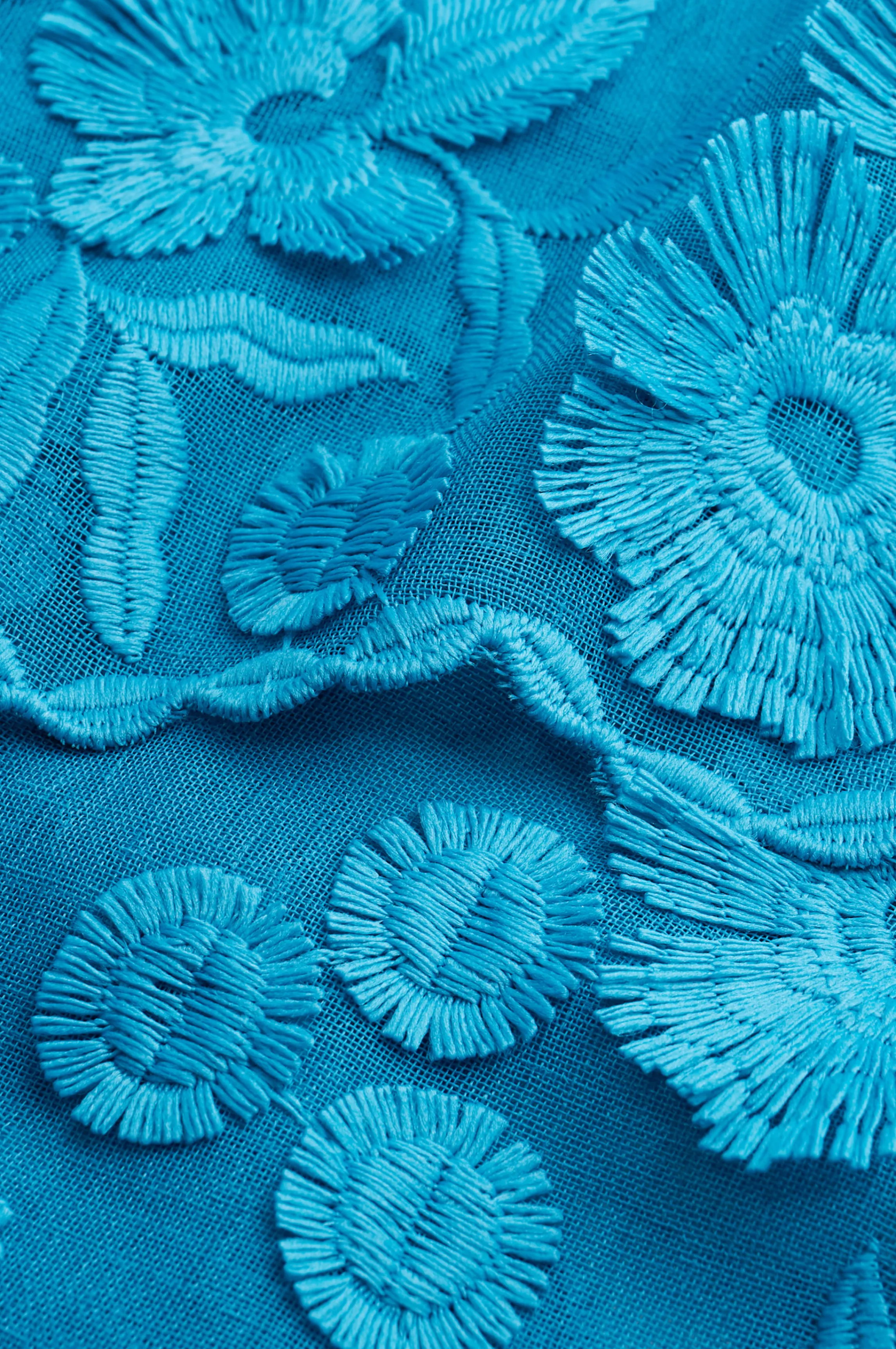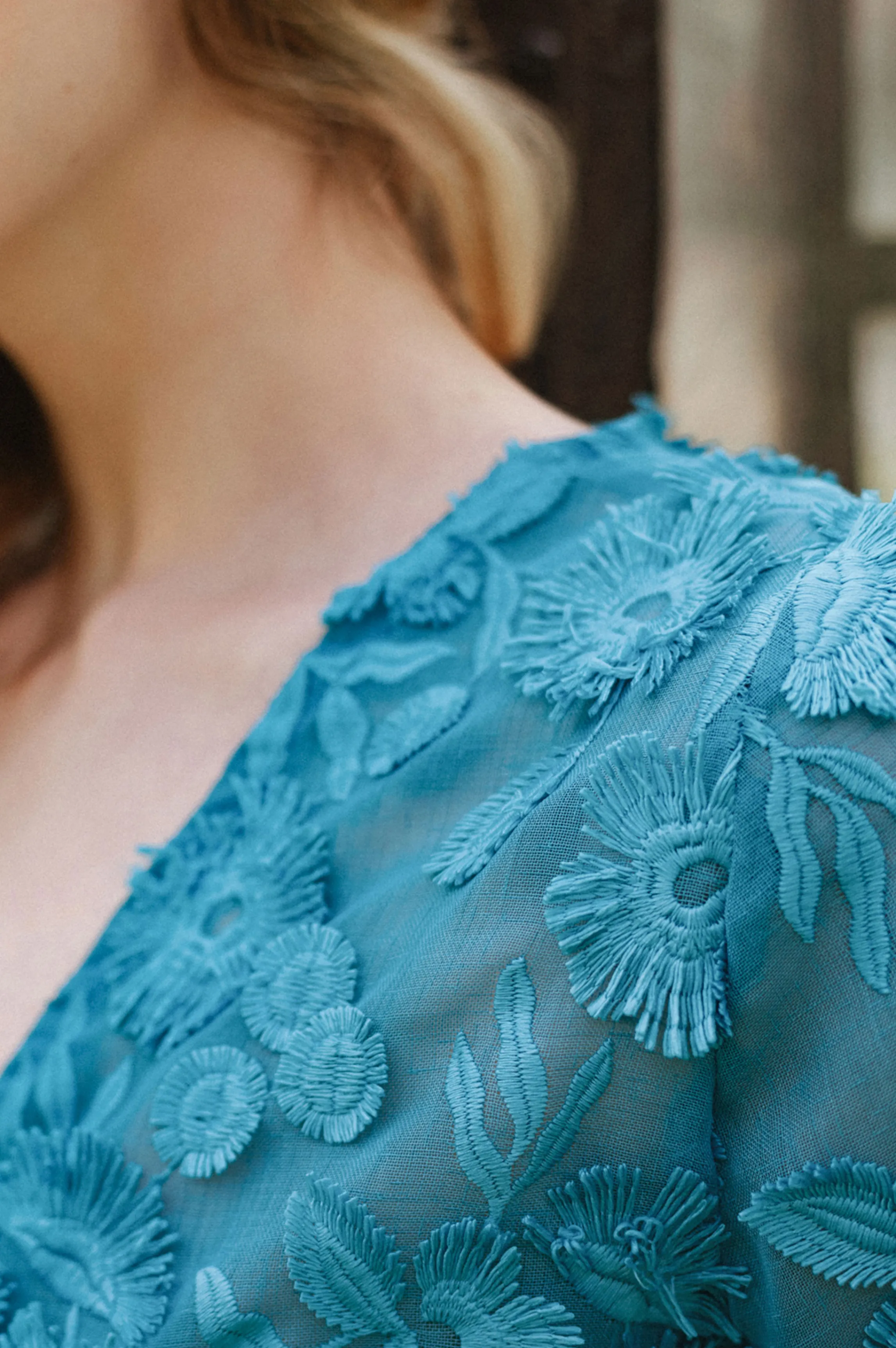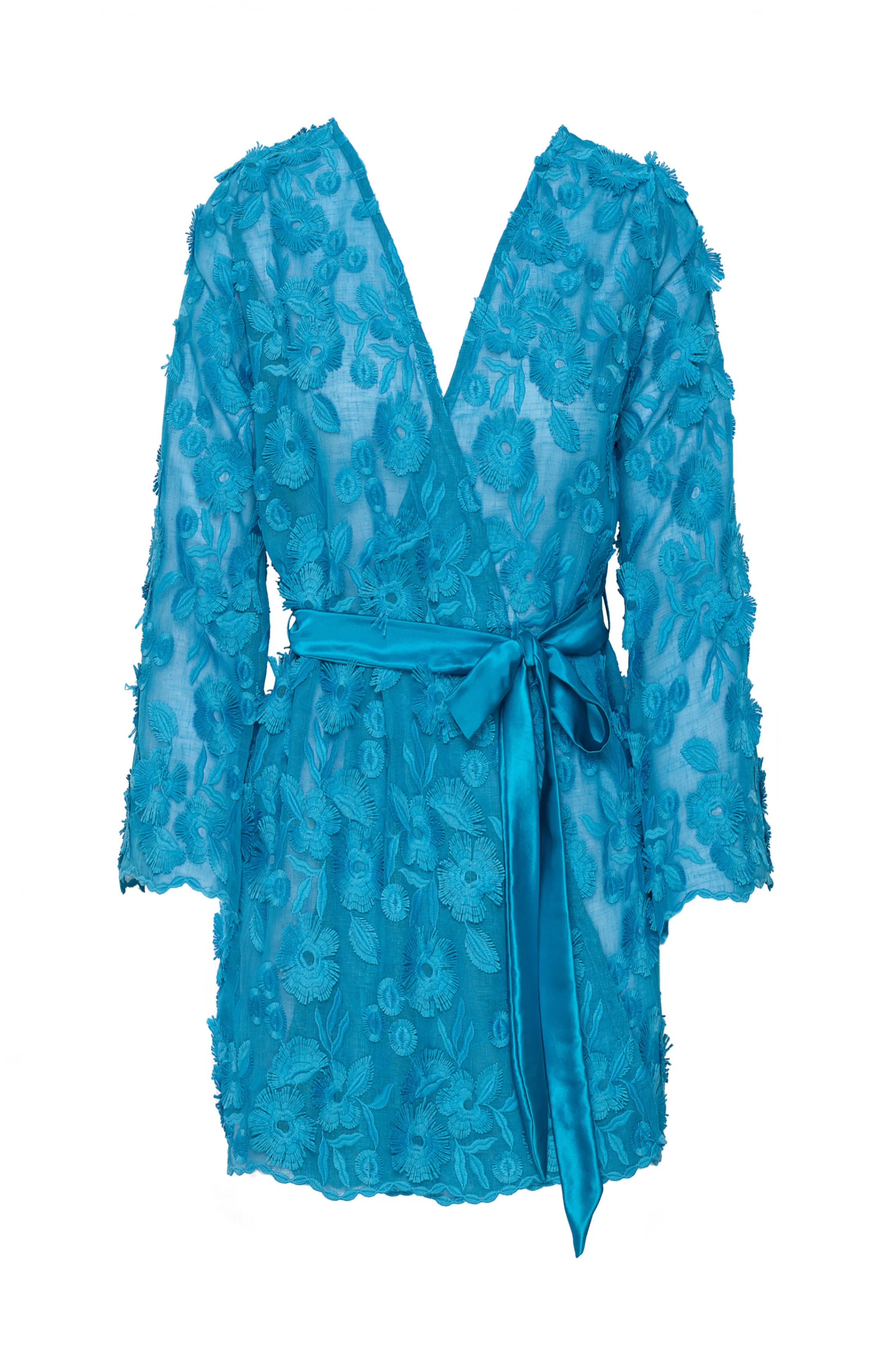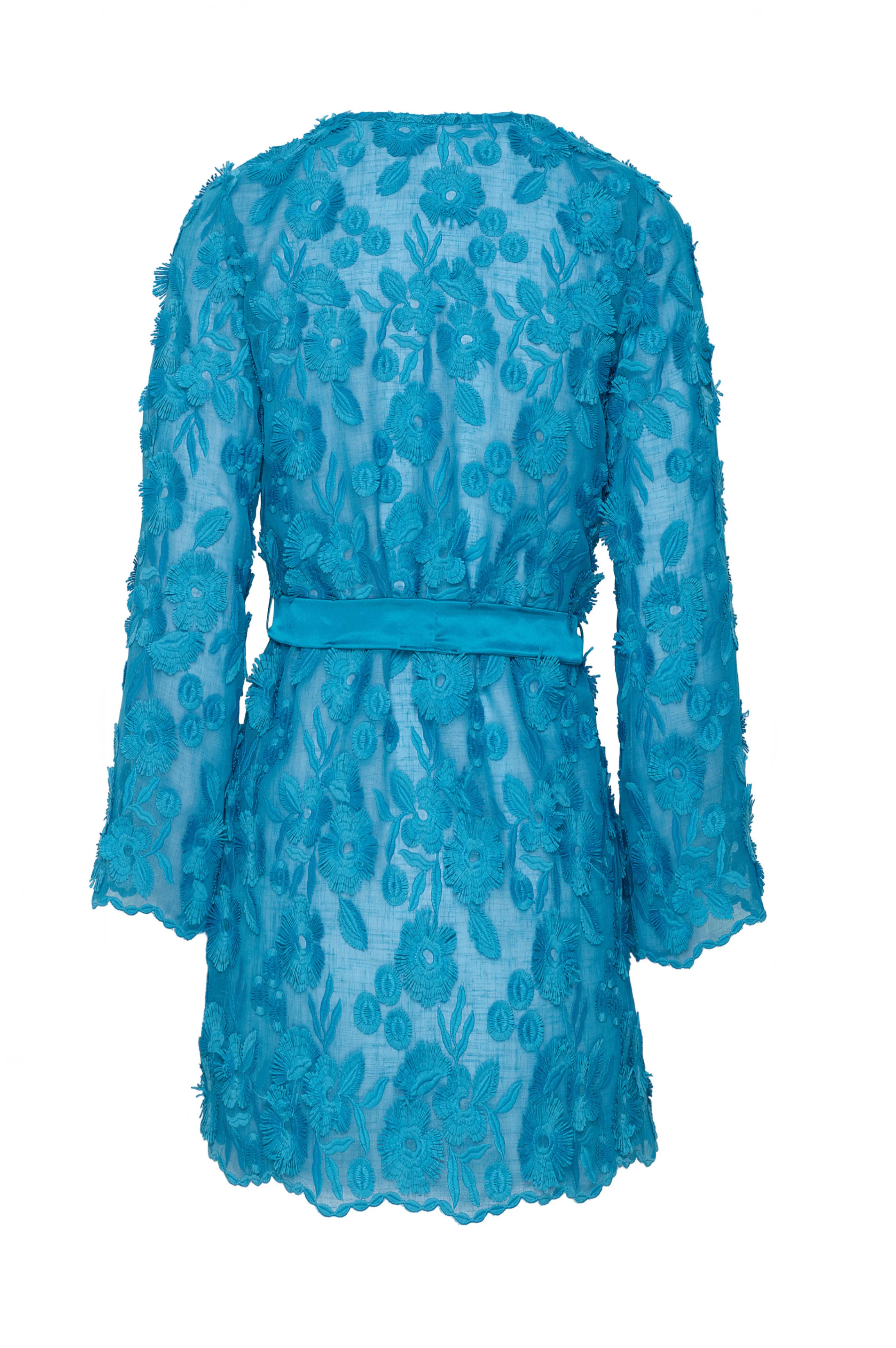 Blue linen kimono embroidered with small tone-on-tone embossed flowers. An ultra light and comfortable fabric.