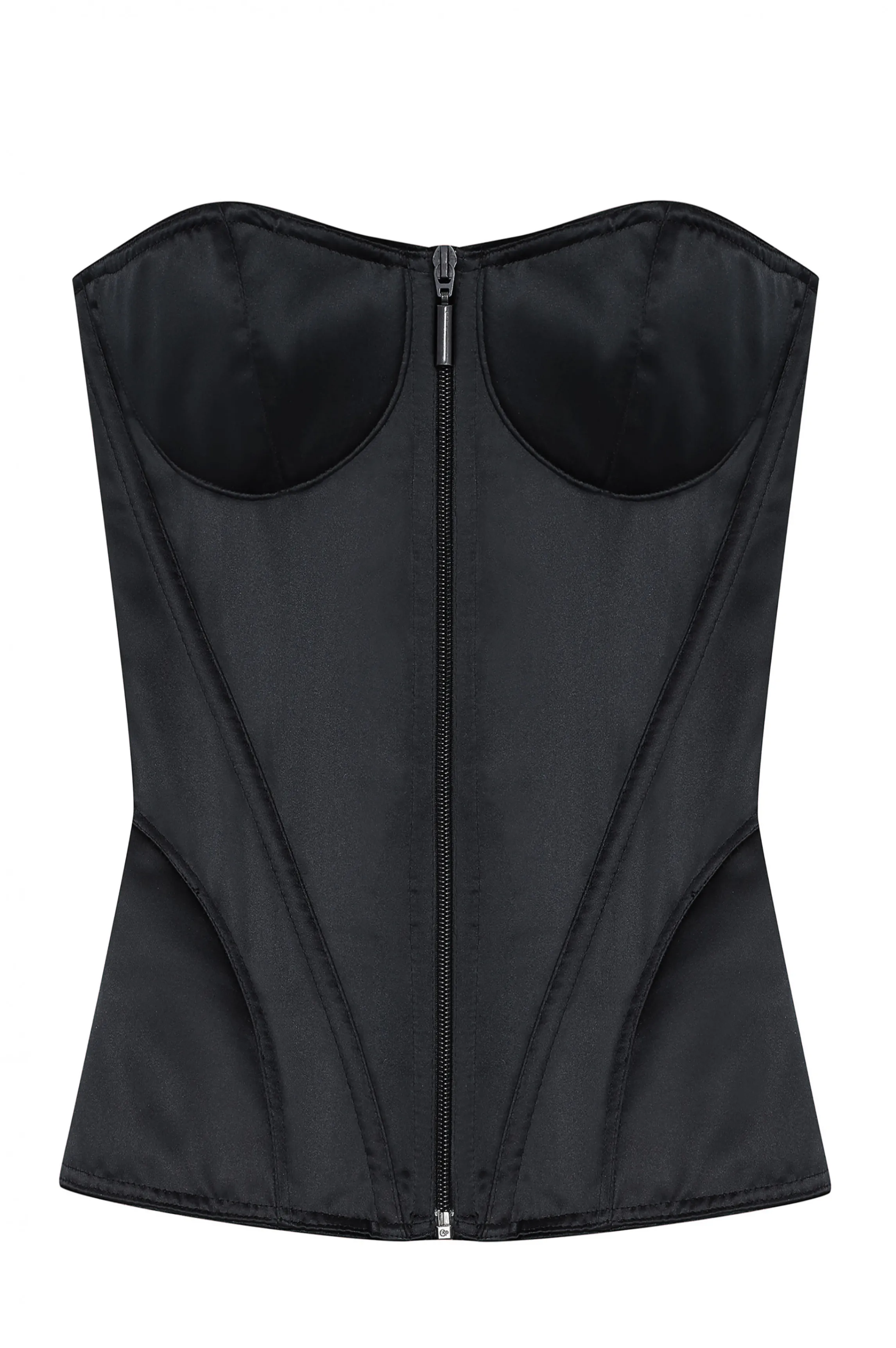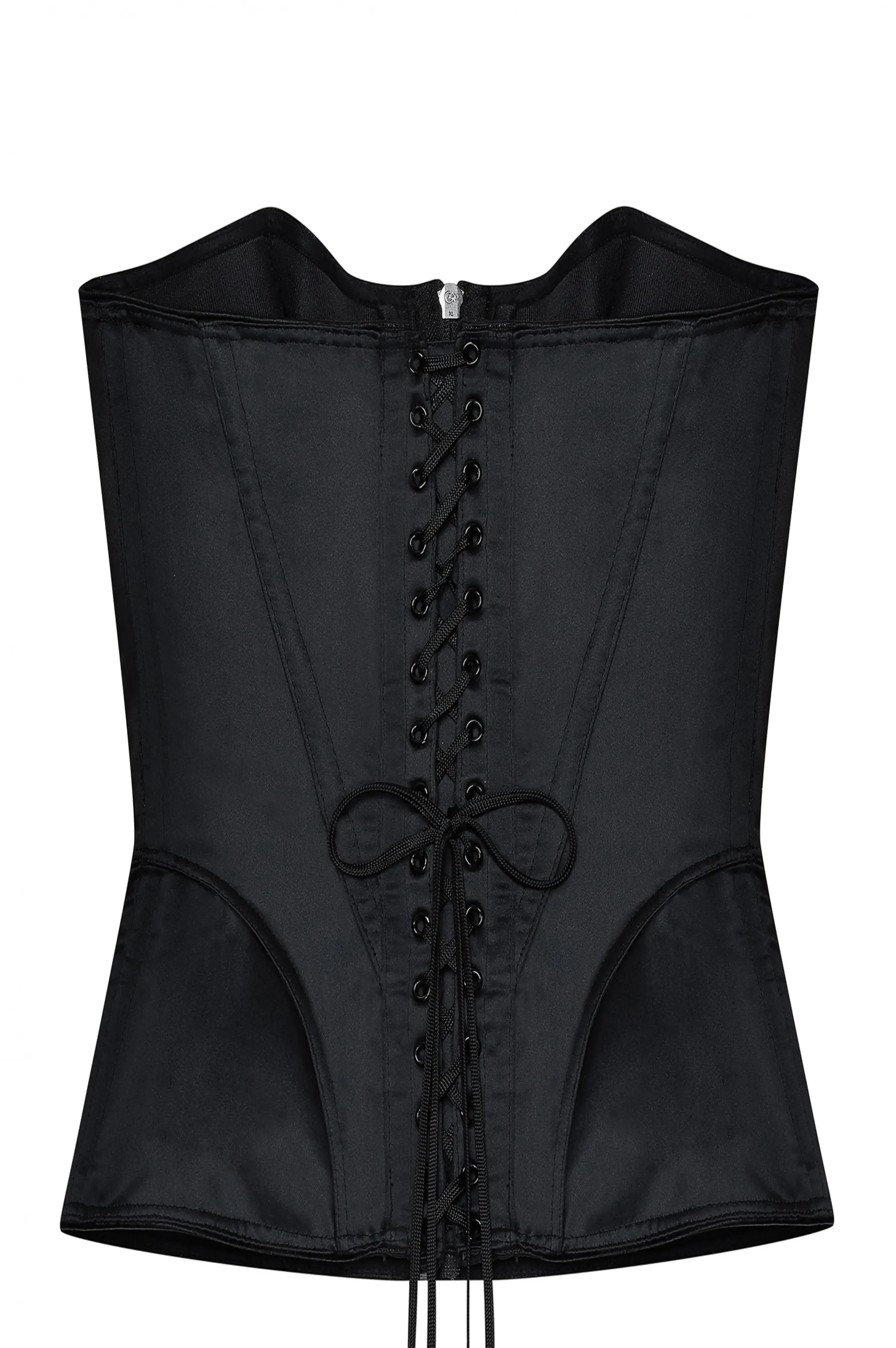 Black satin corset with front opening by a zipper. Real lacing in the back.