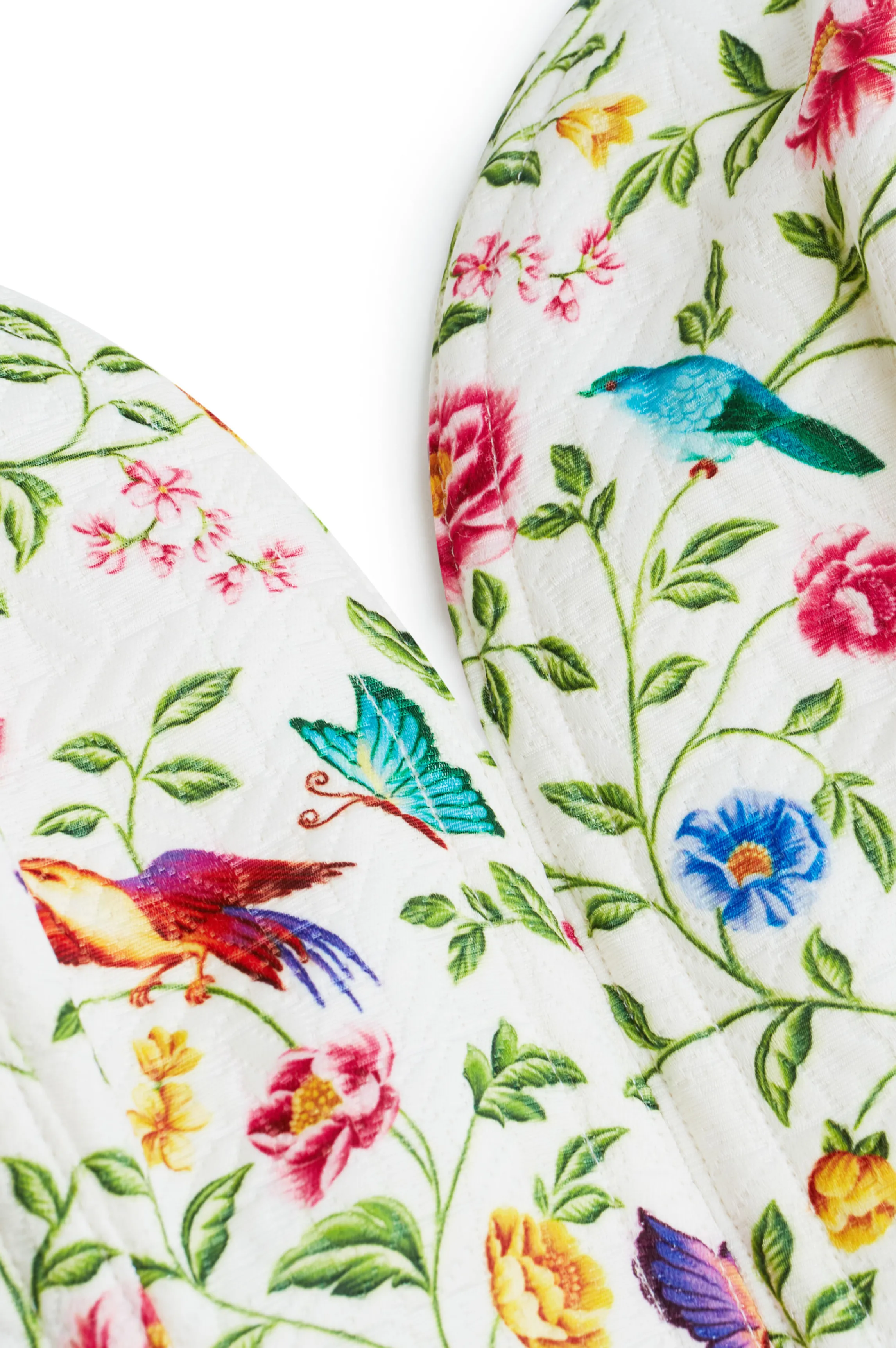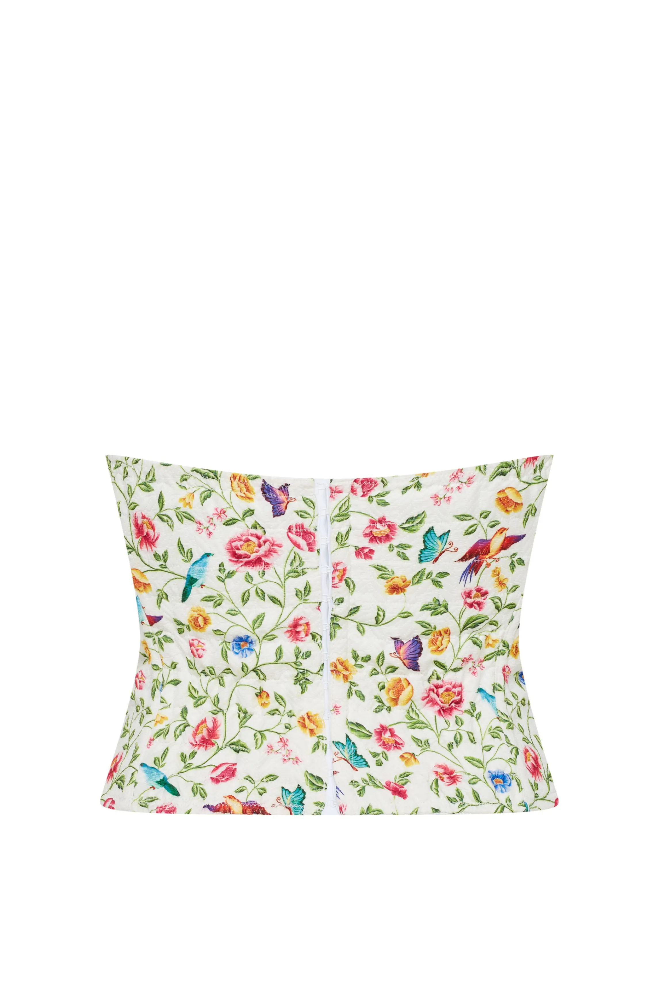 Short bustier made of cotton printed with flowers and little birds. Short cut on the hipline. Beautiful neckline. …