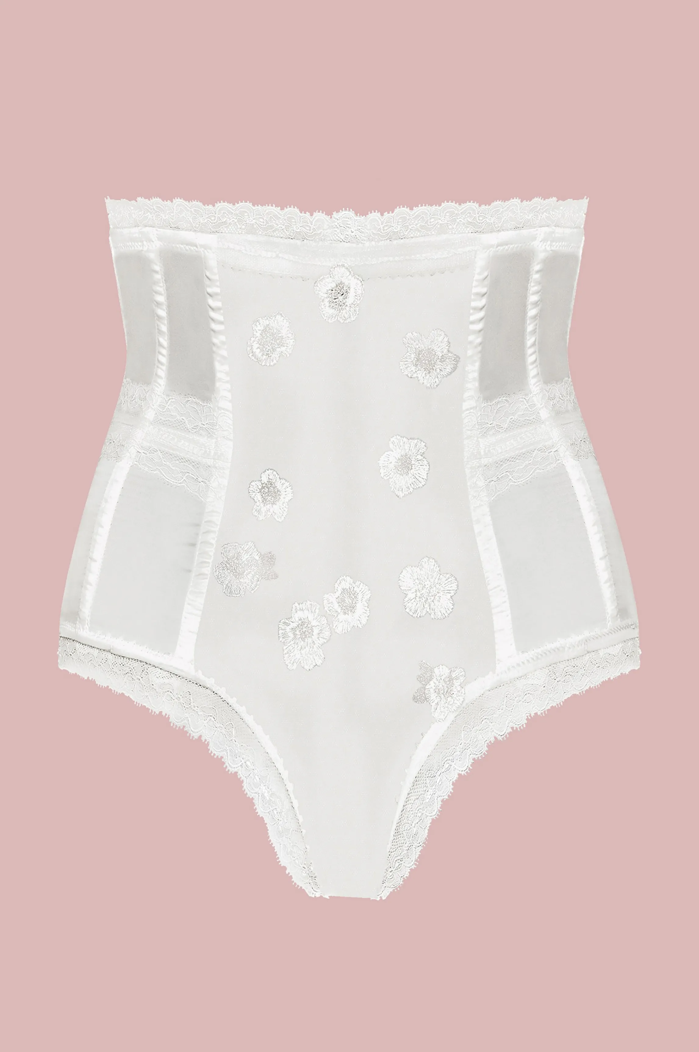High waist ultra-shaping panties of materials mixing tulle with embroidered satin. The tanga cut on the buttocks has a v…