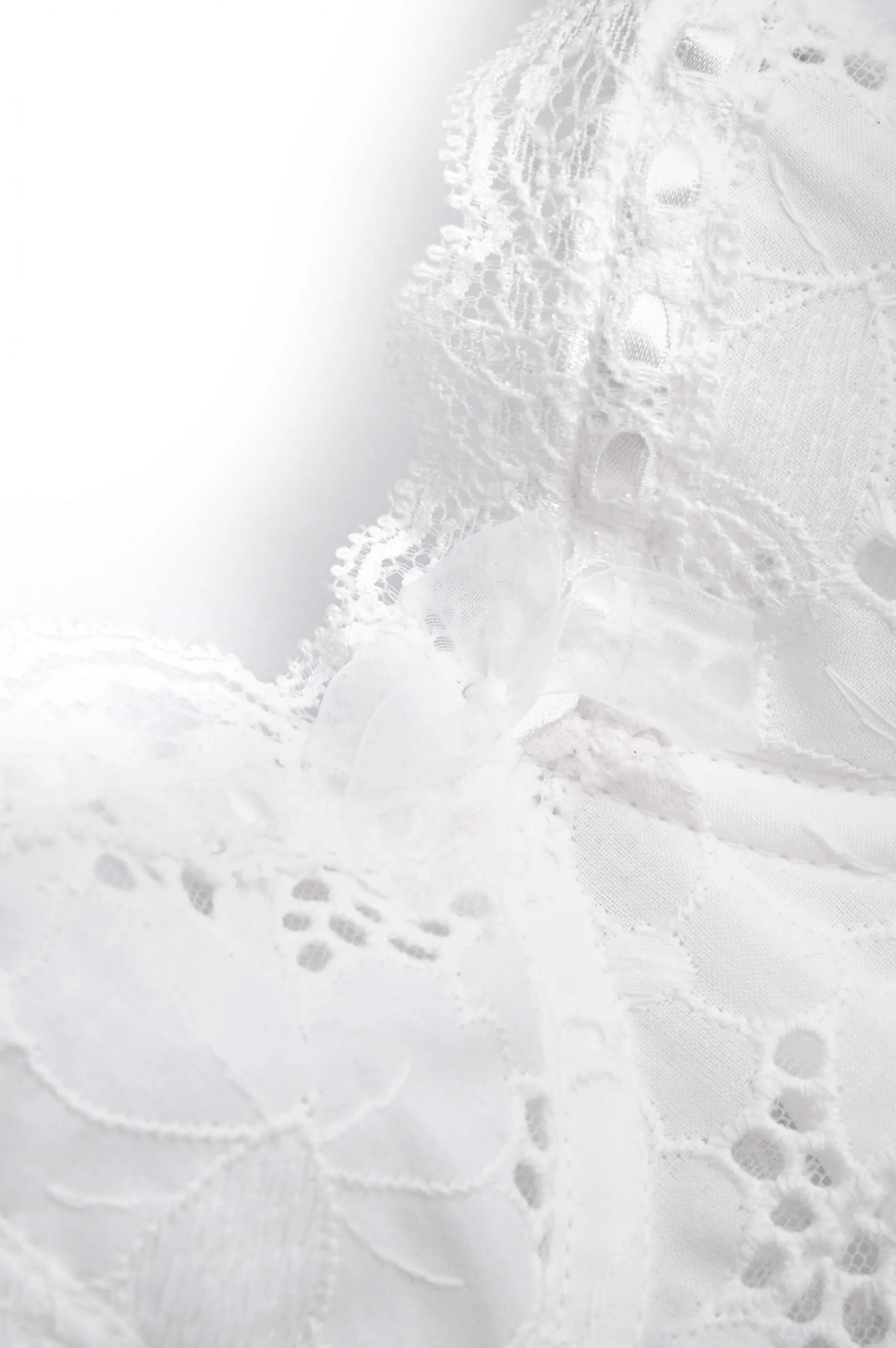 This bustier is made entirely of embroidered cotton. The neckline and straps are trimmed with delicate Valencian lace. The cups have been created in different sizes and are foam-lined, to effectively enhance your décolleté regardless of your bust size. The back is ultra-stretchy thanks to elastic threads that make it extremely comfortable to wear. Baleine, the Salsa bustier delicately contains and enhances your pretty curves. Side zipper. Match with MIMI white broderie anglaise panties to create a perfect ensemble.