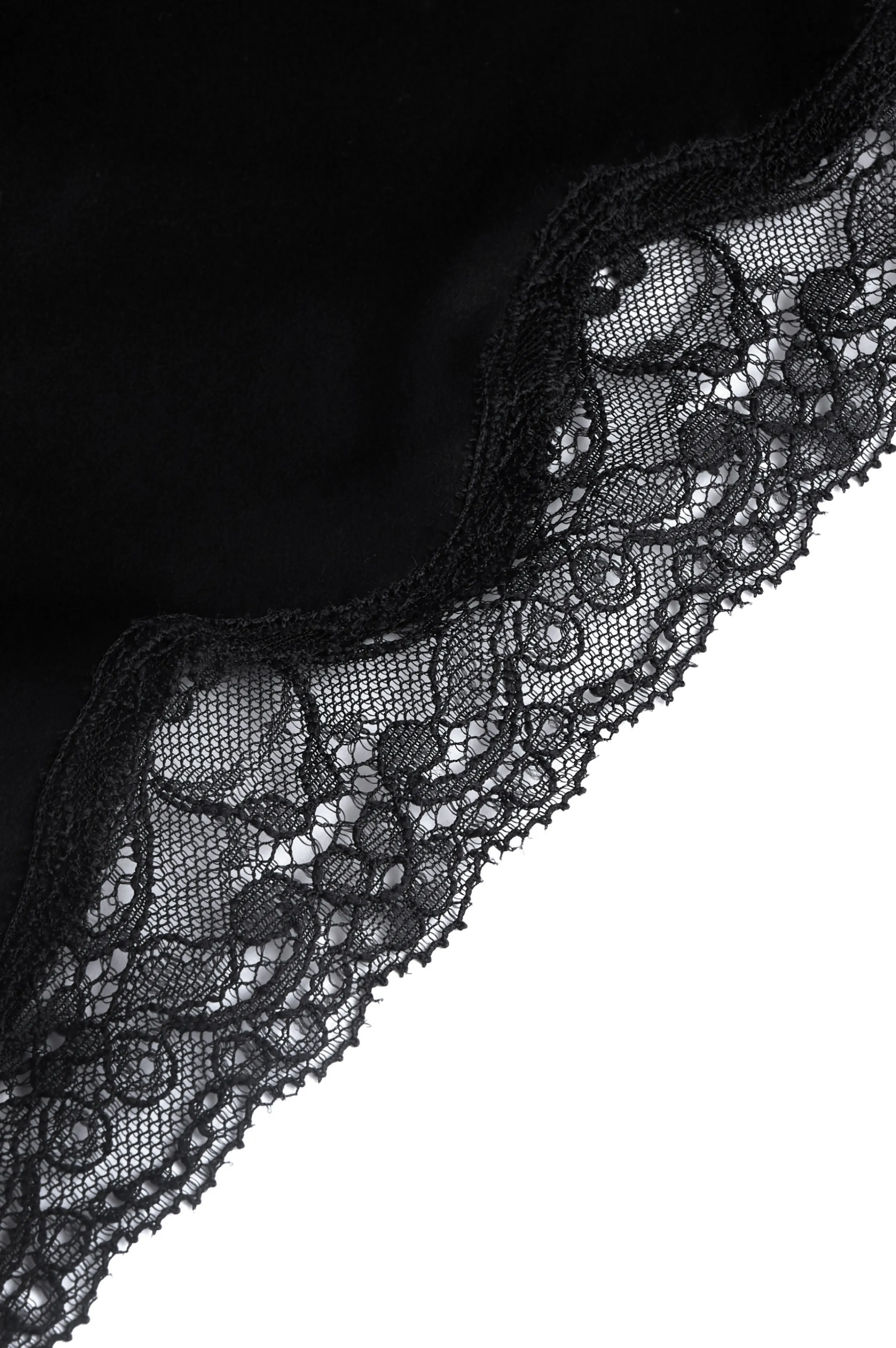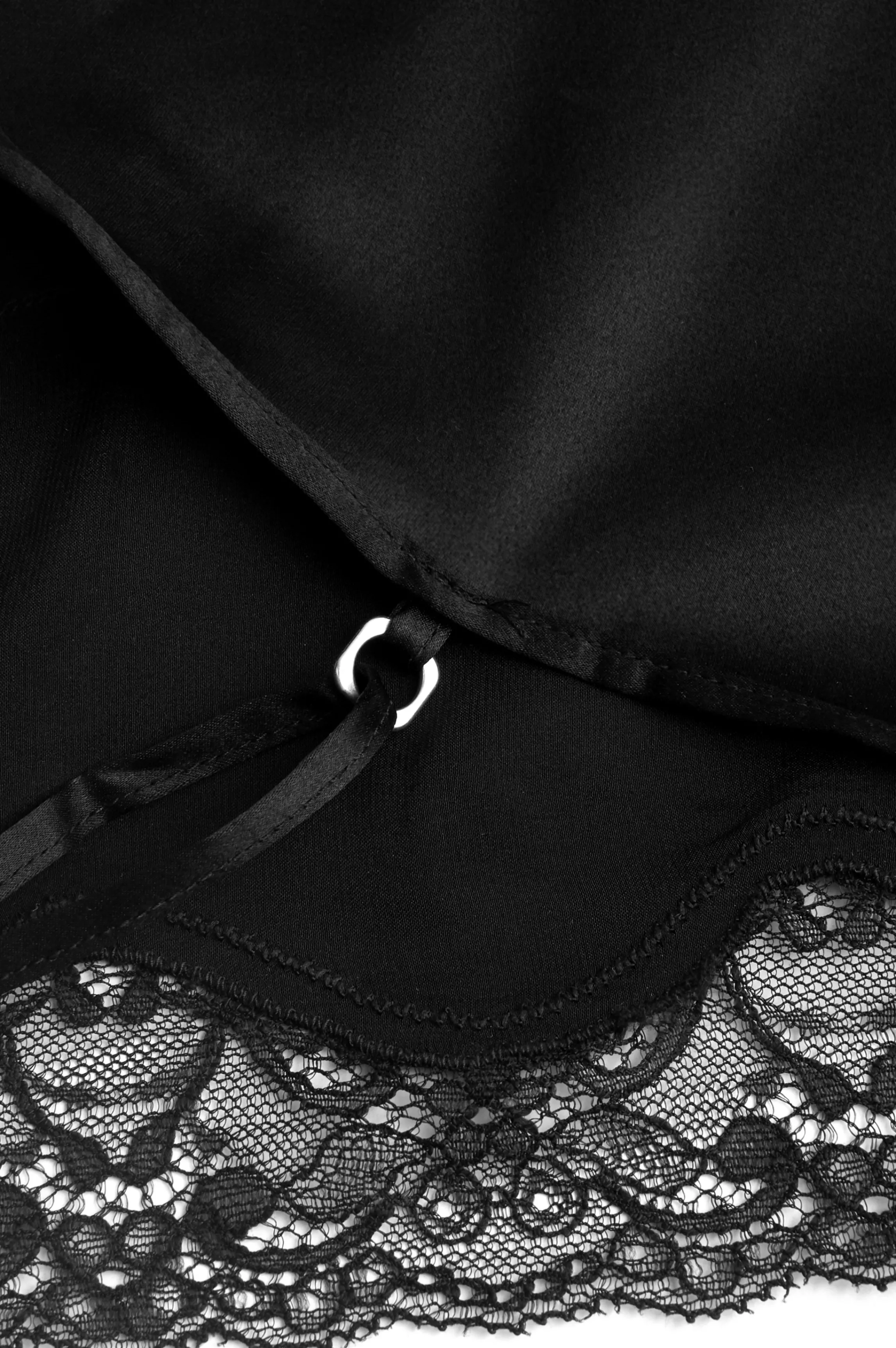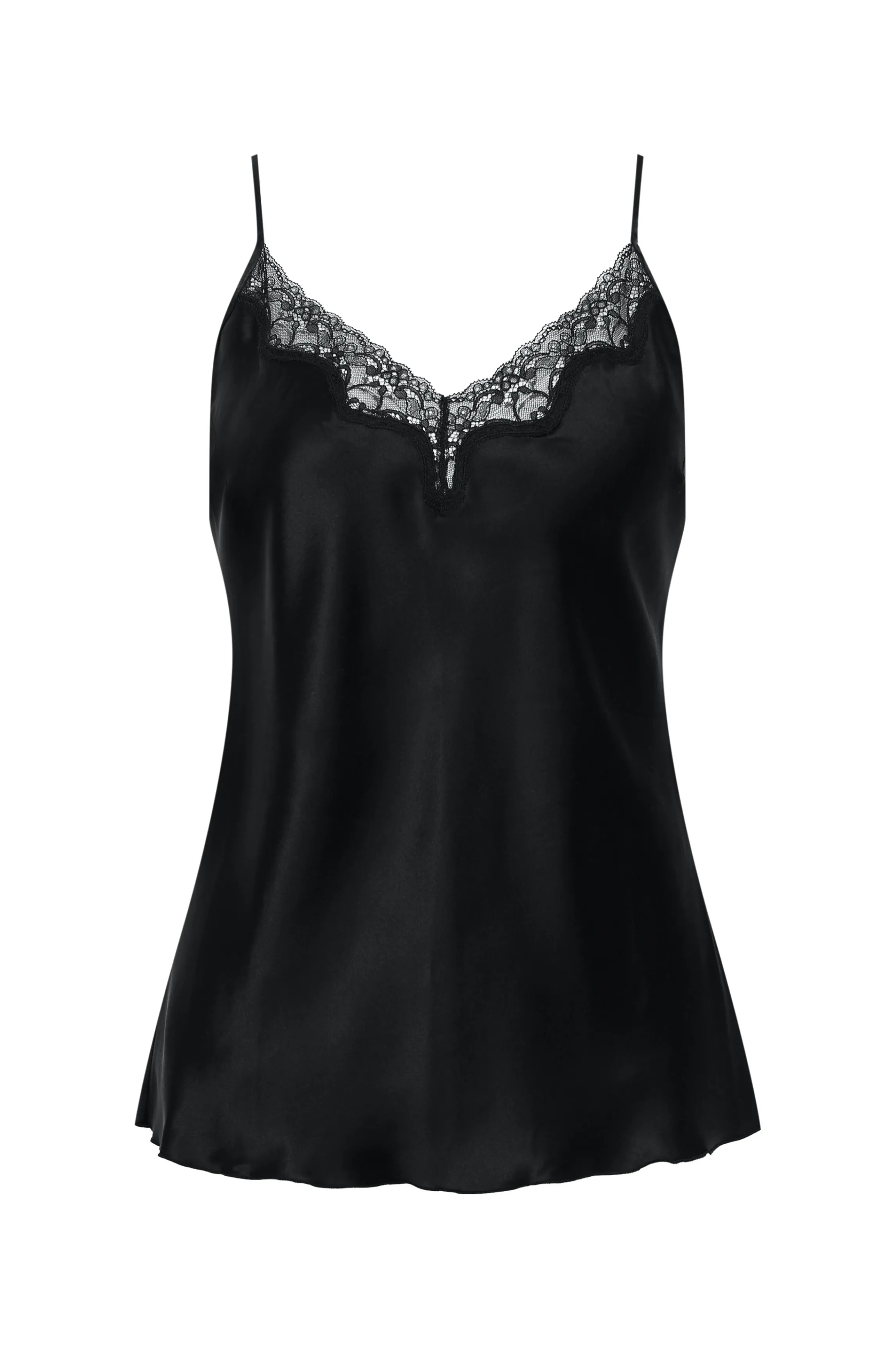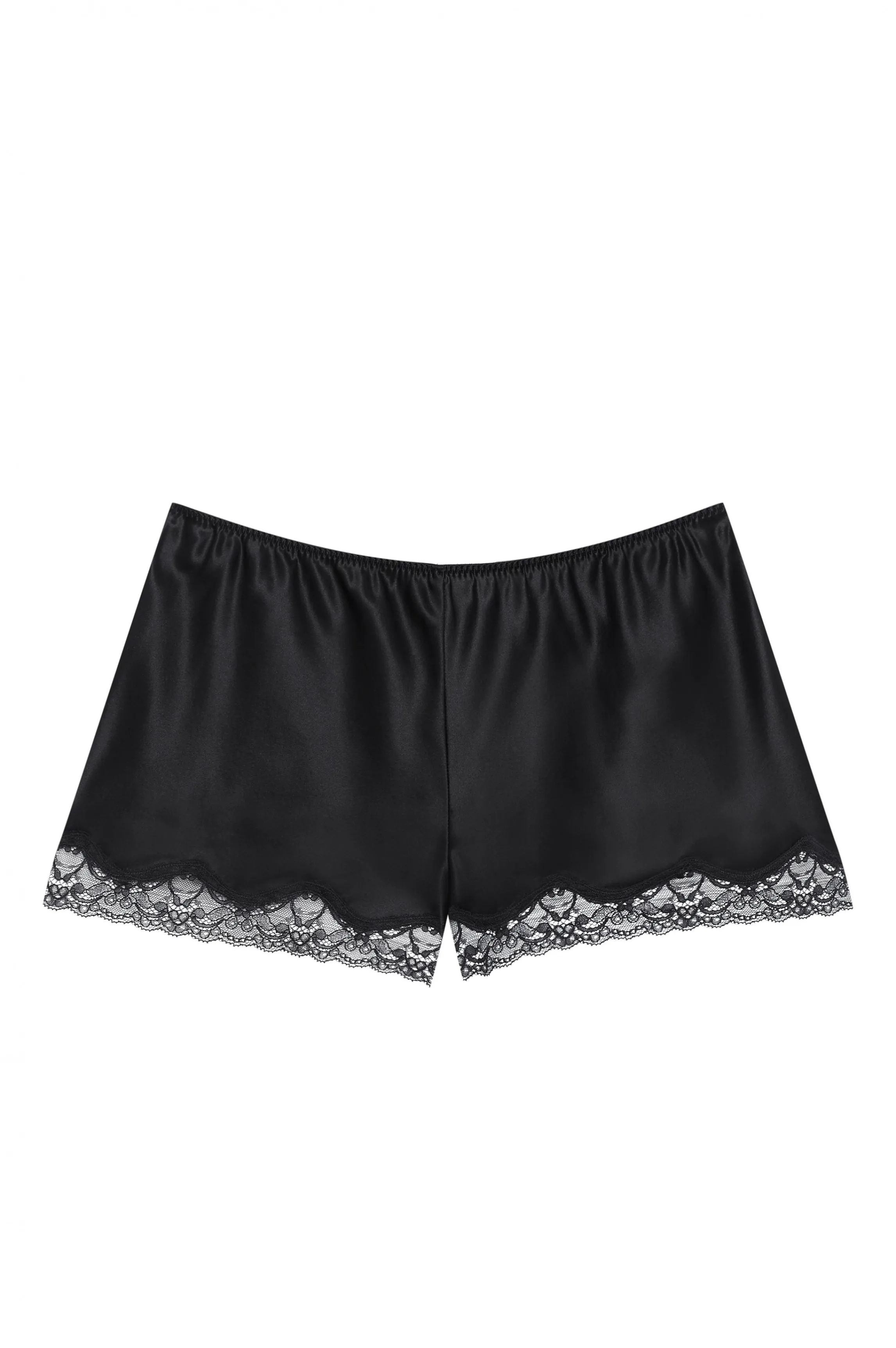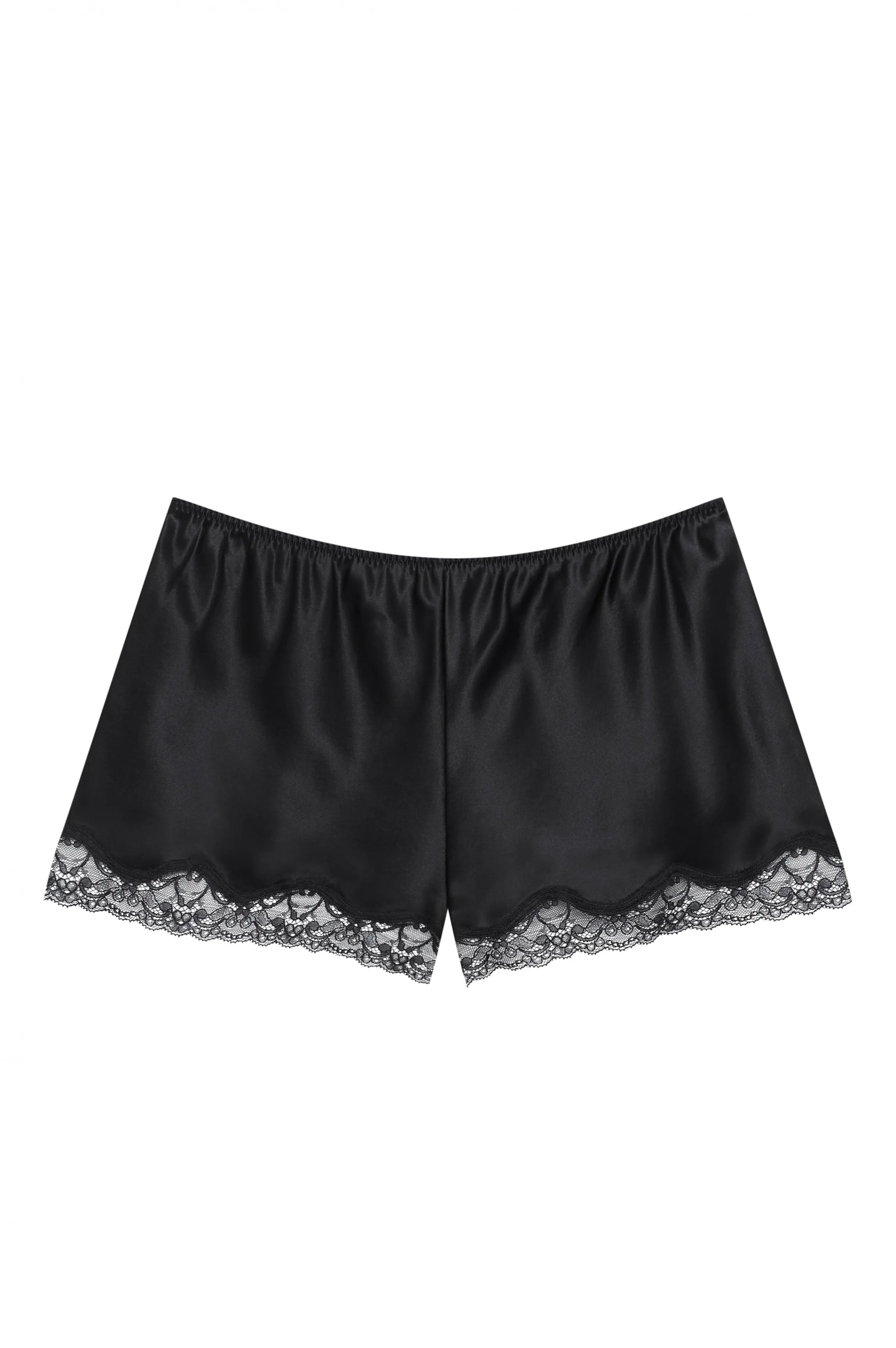 A two-piece pyjamas made in black silk. A beautiful black lace runs along the neckline and around the legs. The matching cami and shorts are a basic homewear outfit, revisited in noble fabrics.