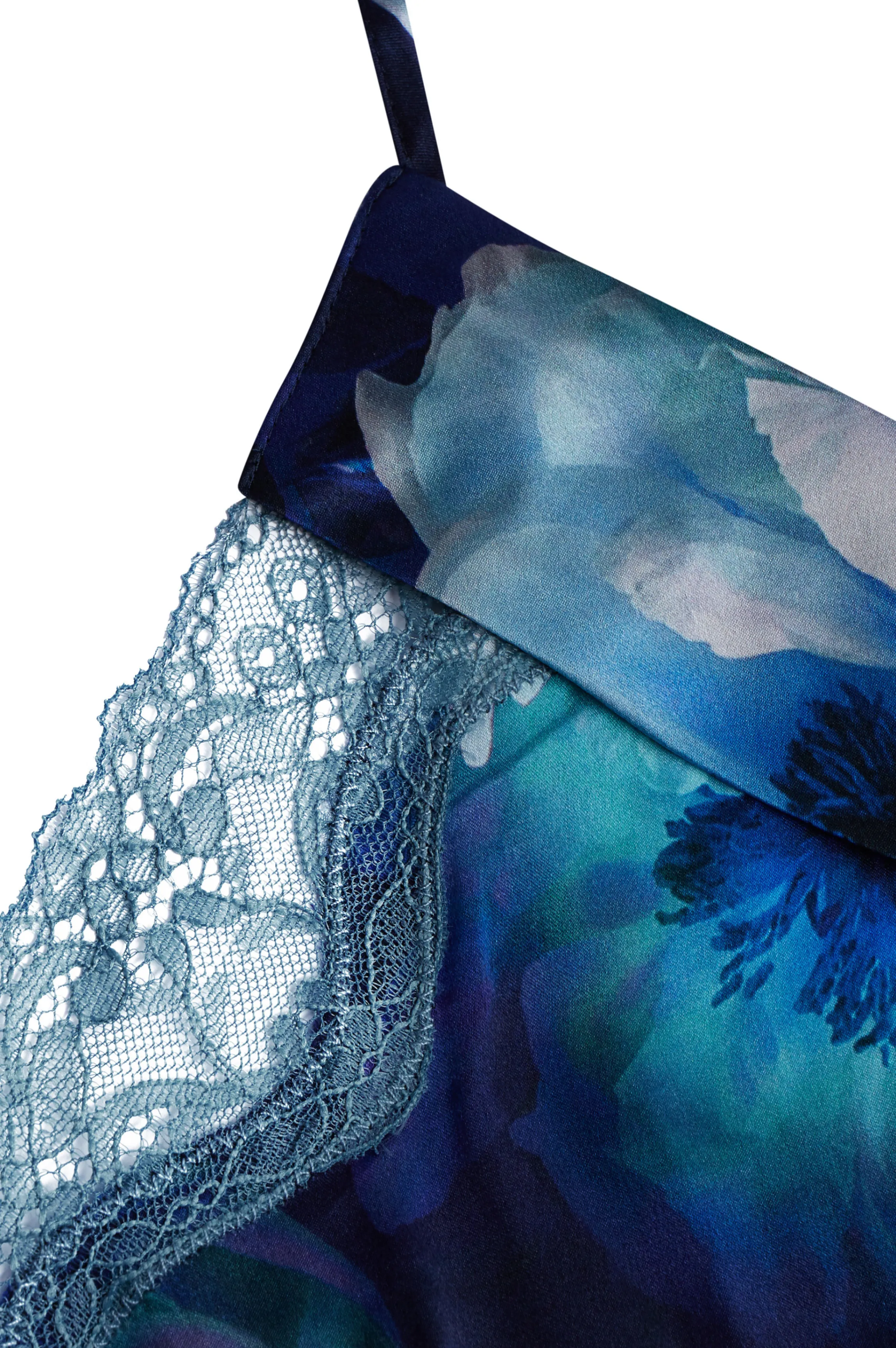 Blue silk nightdress lined with blue lace on the thigh slit. Its straps are adjustable. Its cut delicately follows your figure while bending the waist.