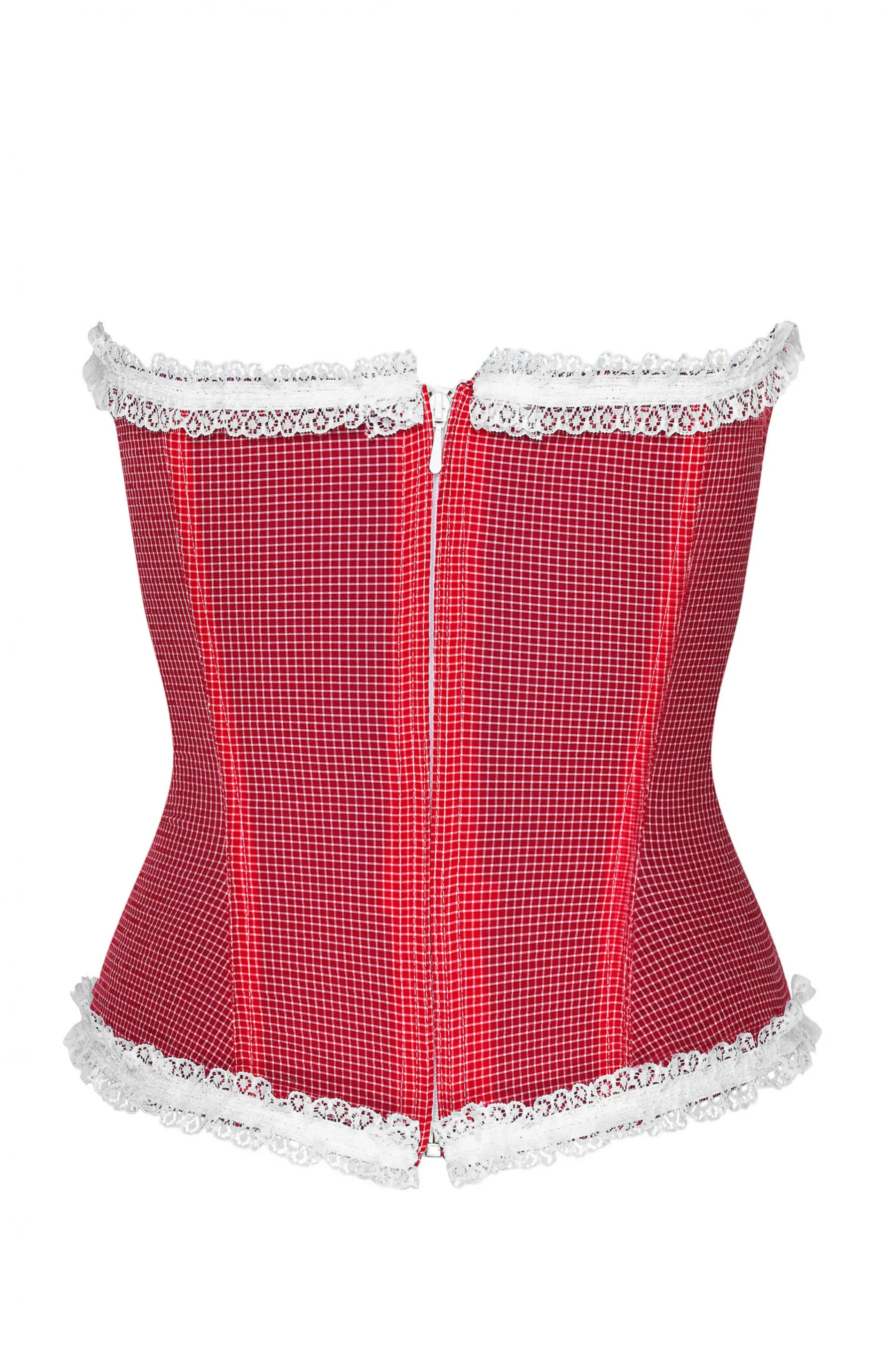 The iconic Victoria bustier in a red gingham fabric. Little ruffles are running along the neckline, designed in a round heart-shape. This style sculpts the figure and thins your waist line. Its stretch fabric provides elasticity and comfort. Thanks to the zipper on the back you can remove the bustier with a simple gesture.