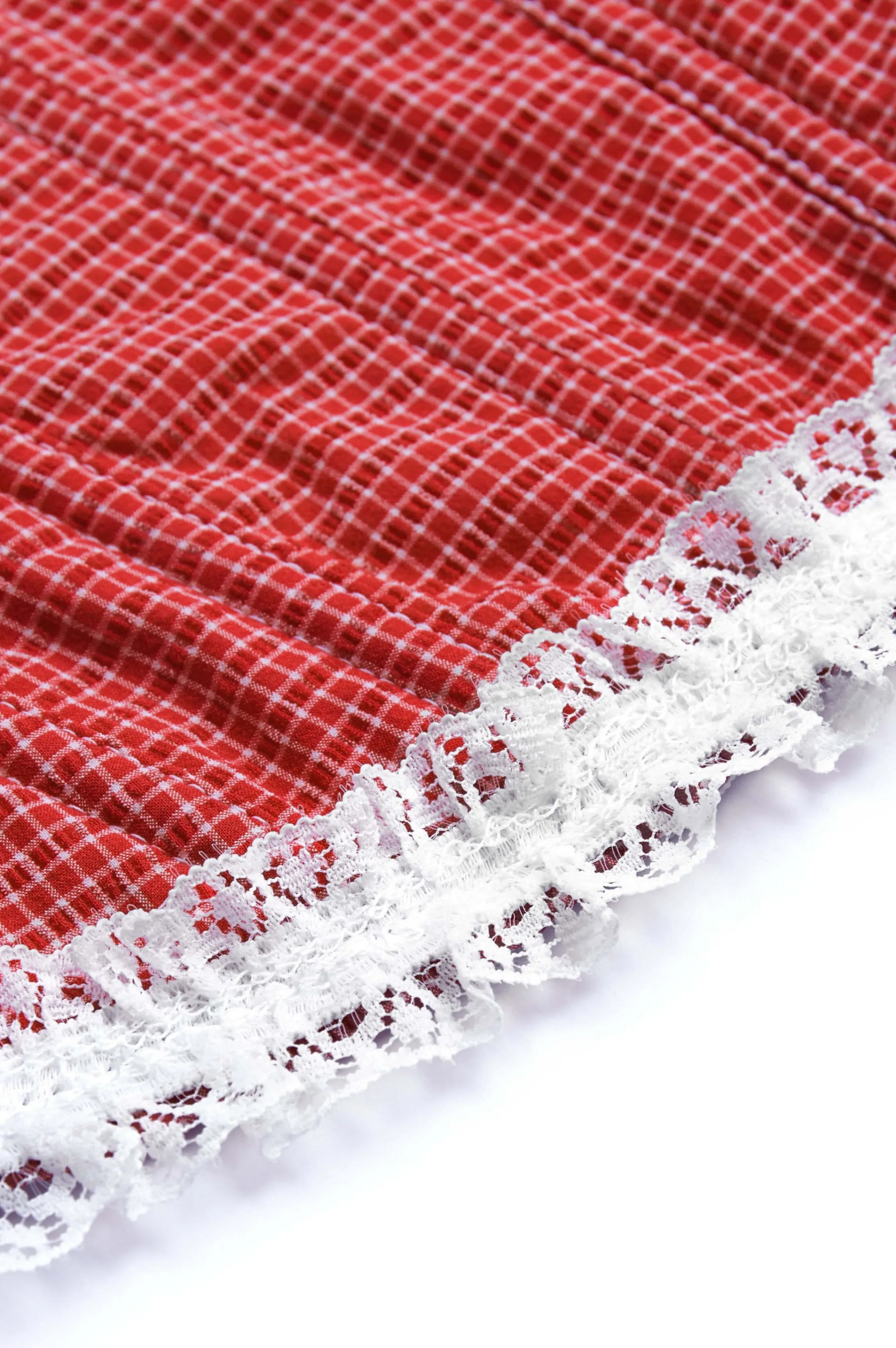 The iconic Victoria bustier in a red gingham fabric. Little ruffles are running along the neckline, designed in a round …